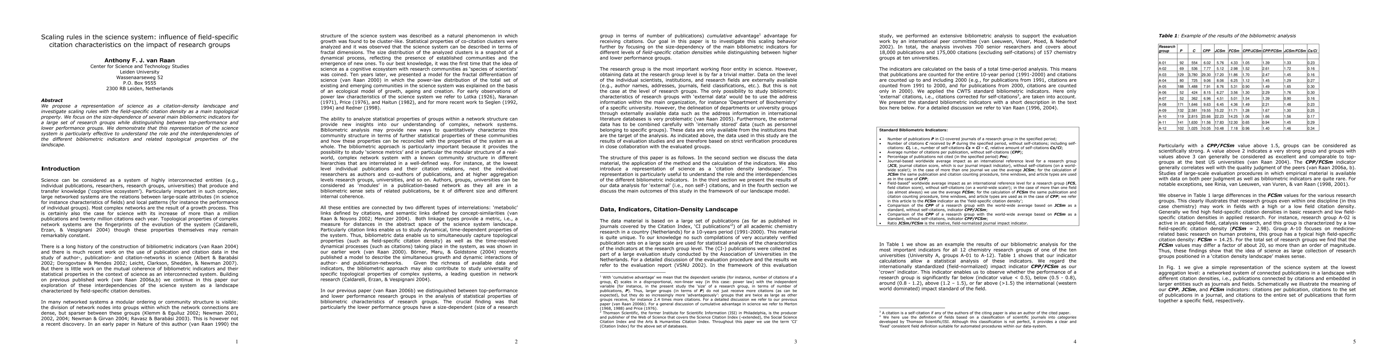 We propose a representation of science as a citation-density landscape and investigate scaling rules with the field-specific citation density as a main topological property. We focus on the size-dependence of several main bibliometric indicators for a large set of research groups while distinguishing between top-performance and lower performance groups. We demonstrate that this representation of the science system is particularly effective to understand the role and the interdependencies of the different bibliometric indicators and related topological properties of the landscape.