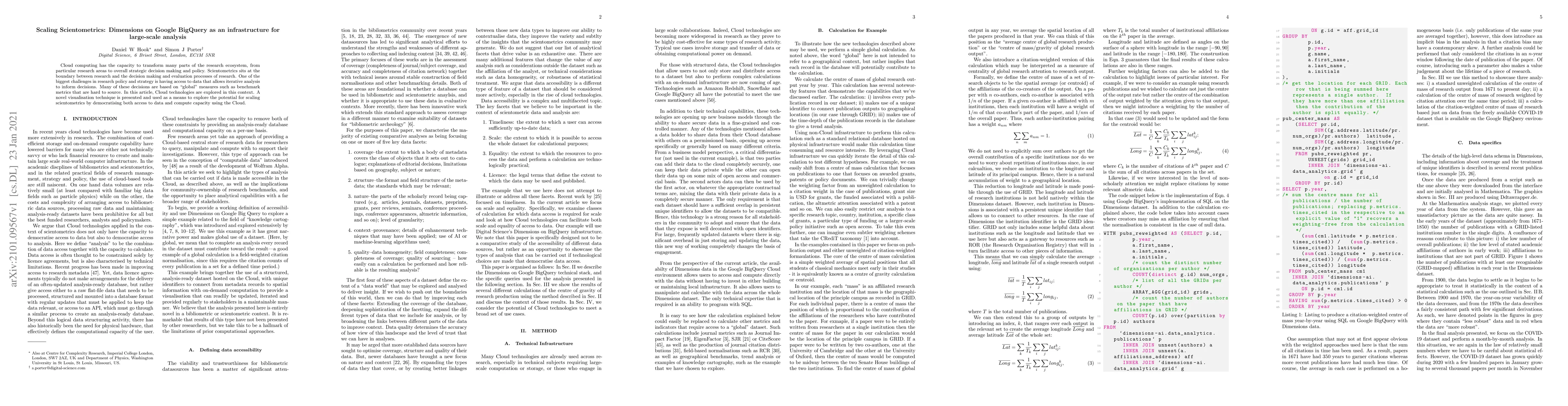 This paper explores using Google BigQuery to scale scientometrics research by providing accessible data and compute capacity for iterative analysis. It presents a novel visualization technique to inform research policy and strategy decisions with cloud-based tools.