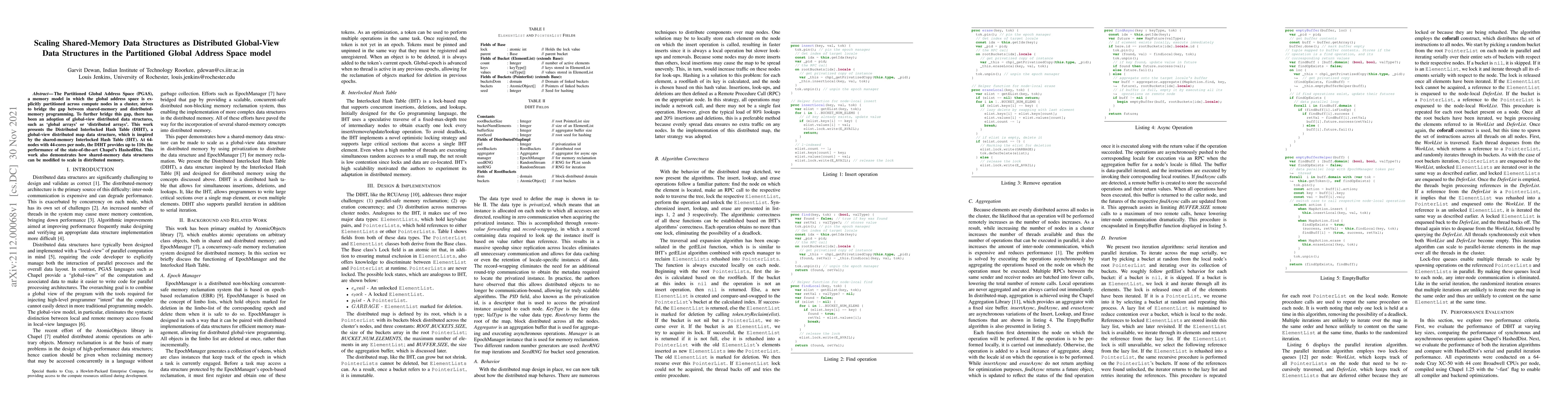 This paper explores the adaptation of shared-memory data structures to function as distributed global-view data structures within the Partitioned Global Address Space (PGAS) model. It introduces the Distributed Interlocked Hash Table (DIHT), which scales shared-memory hash tables for distributed environments, achieving up to 110x performance improvement over the Chapel standard-library HashedDist at 64 nodes.