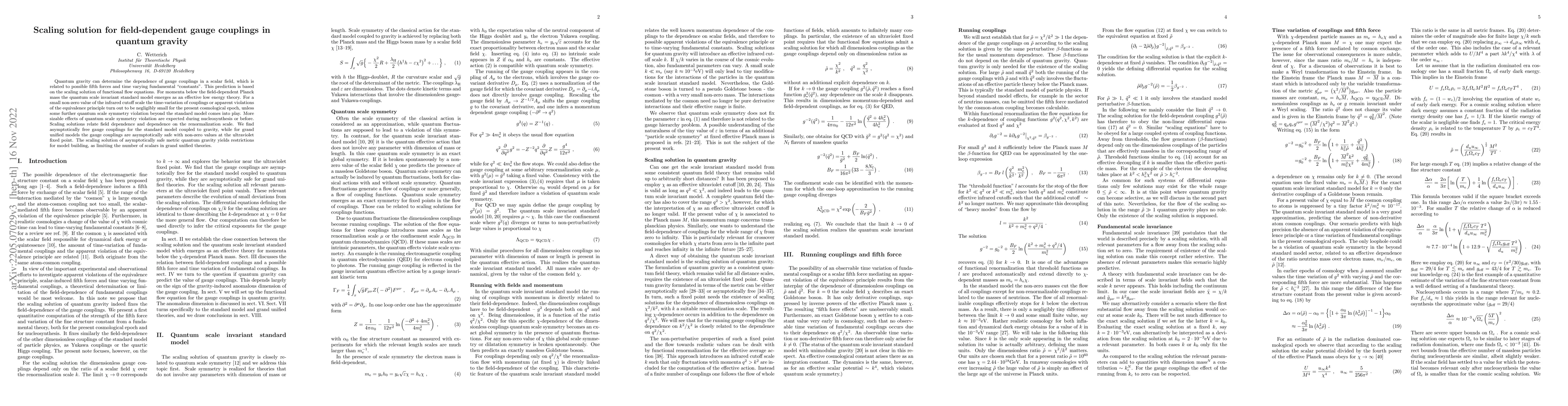 Quantum gravity can determine the dependence of gauge couplings in a scalar field, which is related to possible fifth forces and time varying fundamental "constants". This prediction is based on the scaling solution of functional flow equations. For momenta below the field-dependent Planck mass the quantum scale invariant standard model emerges as an effective low energy theory. For a small non-zero value of the infrared cutoff scale the time-variation of couplings or apparent violations of the equivalence principle turn out to be negligibly small for the present cosmological epoch, unless some further quantum scale symmetry violation beyond the standard model comes into play. More sizable effects of quantum scale symmetry violation are expected during nucleosynthesis or before. Scaling solutions relate field dependence and dependence on the renormalization scale. We find asymptotically free gauge couplings for the standard model coupled to gravity, while for grand unified models the gauge couplings are asymptotically safe with non-zero values at the ultraviolet fixed point. The scaling solution of asymptotically safe metric quantum gravity yields restrictions for model building, as limiting the number of scalars in grand unified theories.