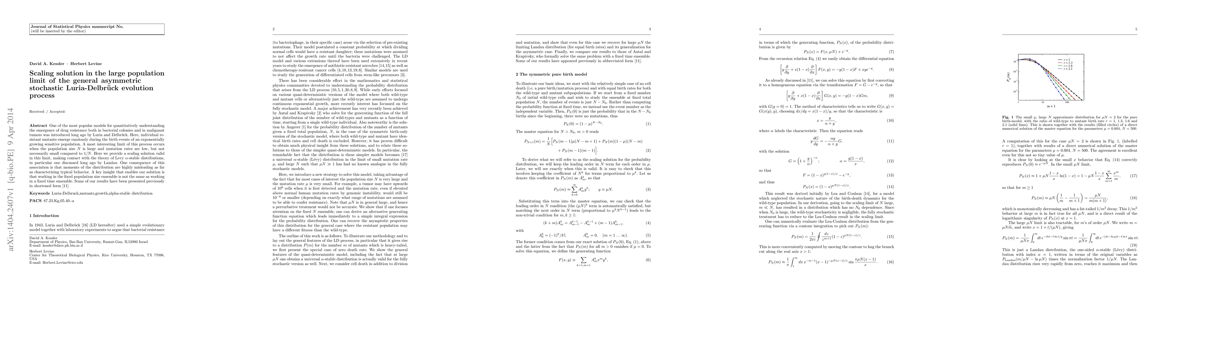 One of the most popular models for quantitatively understanding the emergence of drug resistance both in bacterial colonies and in malignant tumors was introduced long ago by Luria and Delbr\"uck. Here, individual resistant mutants emerge randomly during the birth events of an exponentially growing sensitive population. A most interesting limit of this process occurs when the population size $N$ is large and mutation rates are low, but not necessarily small compared to $1/N$. Here we provide a scaling solution valid in this limit, making contact with the theory of Levy $\alpha$-stable distributions, in particular one discussed long ago by Landau. One consequence of this association is that moments of the distribution are highly misleading as far as characterizing typical behavior. A key insight that enables our solution is that working in the fixed population size ensemble is not the same as working in a fixed time ensemble. Some of our results have been presented previously in shortened form.