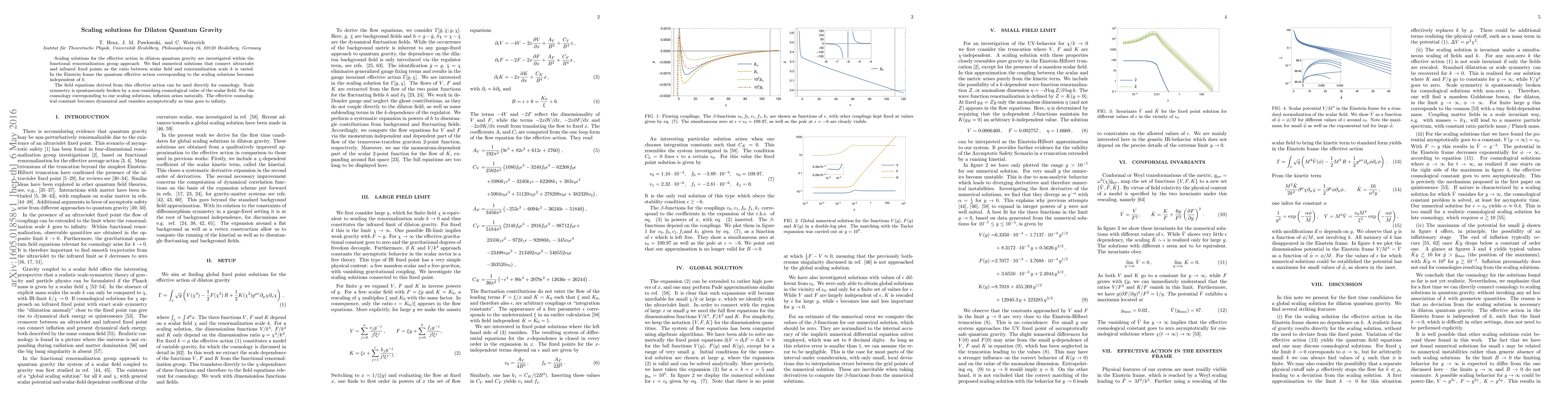 This paper investigates scaling solutions for dilaton quantum gravity using the functional renormalization group approach, finding numerical solutions that bridge ultraviolet and infrared fixed points. The quantum effective action in the Einstein frame becomes $k$-independent, leading to a cosmology where inflation naturally arises and the effective cosmological constant vanishes asymptotically.