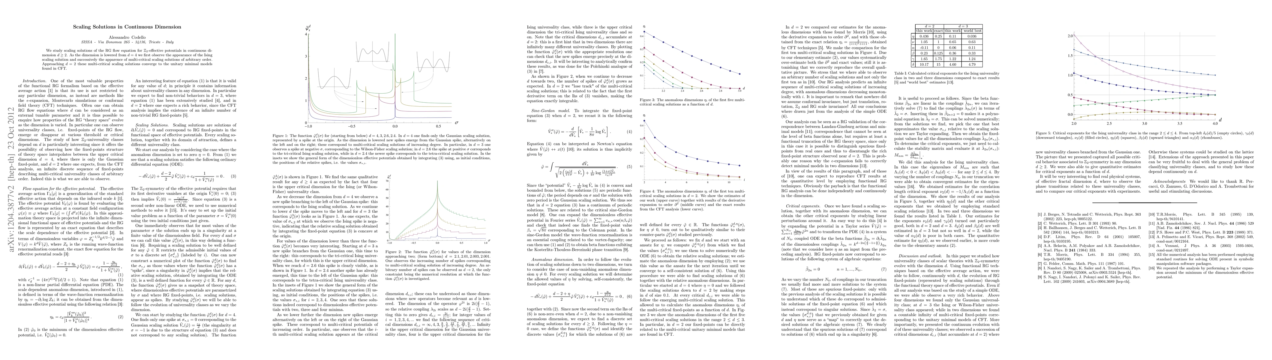 Researchers study scaling solutions of a theoretical model as it transitions from 4 dimensions to 2, revealing the emergence of Ising-like behavior and convergence towards unitary minimal models in Conformal Field Theory.