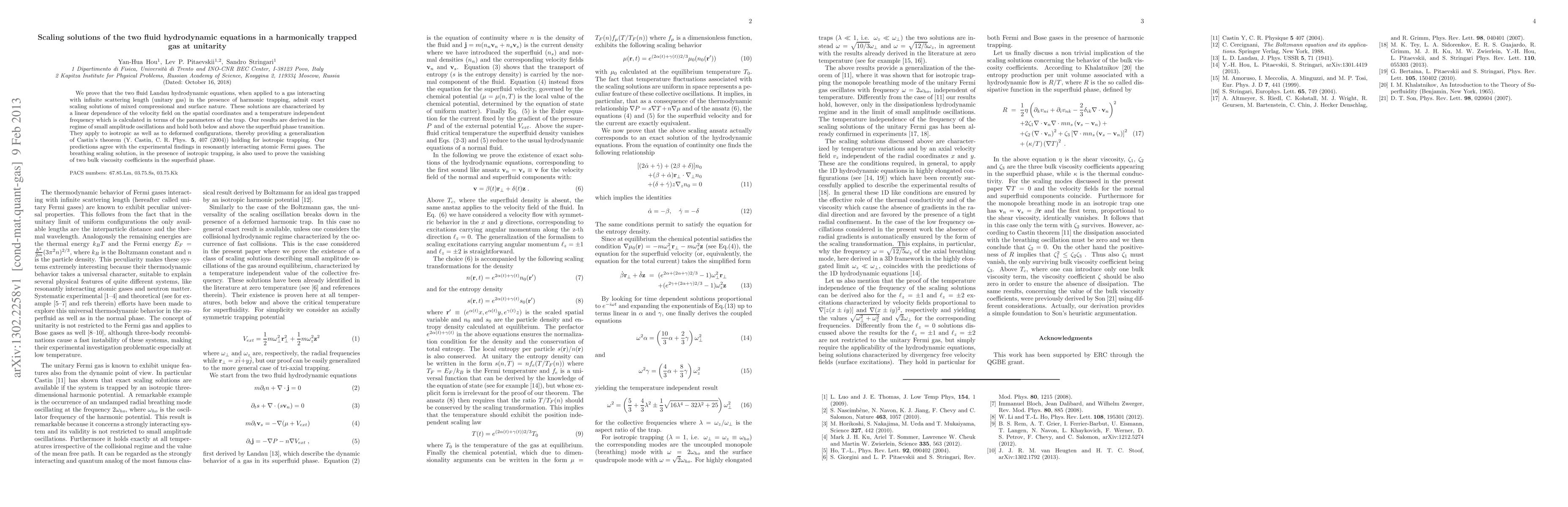We prove that the two fluid Landau hydrodynamic equations, when applied to a gas interacting with infinite scattering length (unitary gas) in the presence of harmonic trapping, admit exact scaling solutions of mixed compressional and surface nature. These solutions are characterized by a linear dependence of the velocity field on the spatial coordinates and a temperature independent frequency which is calculated in terms of the parameters of the trap. Our results are derived in the regime of small amplitude oscillations and hold both below and above the superfluid phase transition. They apply to isotropic as well as to deformed configurations, thereby providing a generalization of Castin's theorem (Y. Castin, C. R. Phys. \textbf{5}, 407 (2004)) holding for isotropic trapping. Our predictions agree with the experimental findings in resonantly interacting atomic Fermi gases. The breathing scaling solution, in the presence of isotropic trapping, is also used to prove the vanishing of two bulk viscosity coefficients in the superfluid phase.