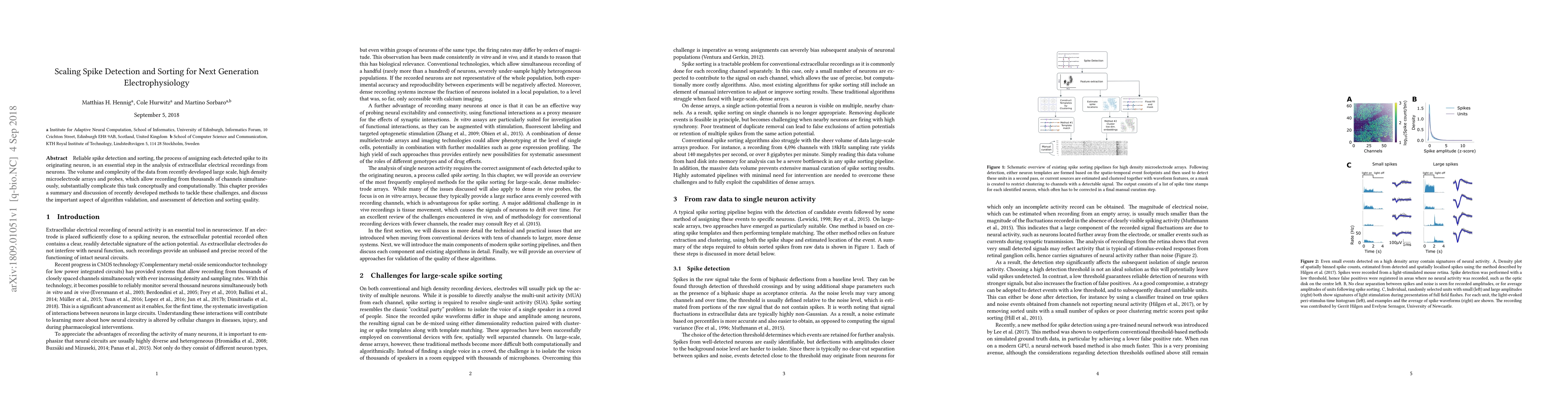 This paper reviews advanced methods for spike detection and sorting in large-scale, high-density electrophysiological recordings, addressing the computational challenges posed by the data volume and complexity. It emphasizes the importance of algorithm validation and quality assessment in ensuring accurate neuron-specific spike assignment.