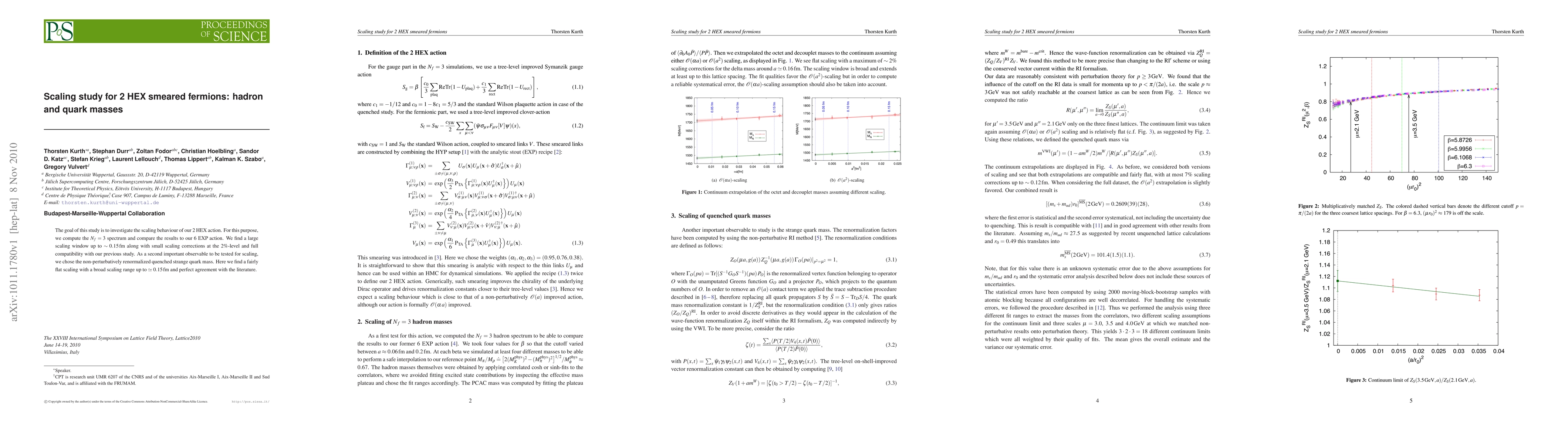 Researchers investigated scaling behavior of 2 HEX action for hadron and quark masses, finding a large scaling window up to 0.15 fm with small corrections.