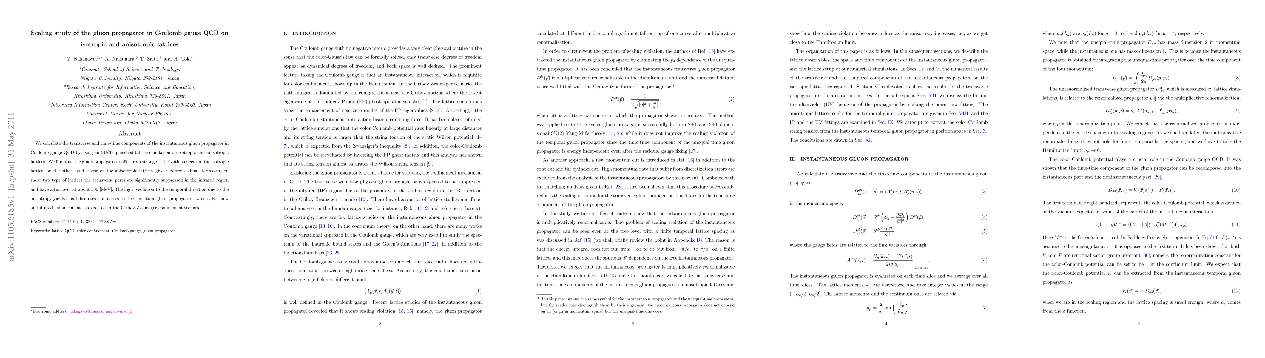 We calculate the transverse and time-time components of the instantaneous gluon propagator in Coulomb gauge QCD by using an SU(3) quenched lattice simulation on isotropic and anisotropic lattices. We find that the gluon propagators suffer from strong discretization effects on the isotropic lattice; on the other hand, those on the anisotropic lattices give a better scaling. Moreover, on these two type of lattices the transverse parts are significantly suppressed in the infrared region and have a turnover at about 500 [MeV]. The high resolution to the temporal direction due to the anisotropy yields small discretization errors for the time-time gluon propagators, which also show an infrared enhancement as expected in the Gribov-Zwanziger confinement scenario.
