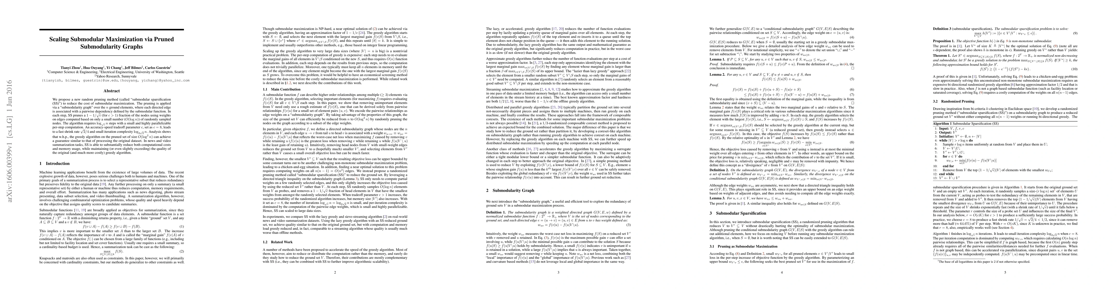 We propose a new random pruning method (called "submodular sparsification (SS)") to reduce the cost of submodular maximization. The pruning is applied via a "submodularity graph" over the $n$ ground elements, where each directed edge is associated with a pairwise dependency defined by the submodular function. In each step, SS prunes a $1-1/\sqrt{c}$ (for $c>1$) fraction of the nodes using weights on edges computed based on only a small number ($O(\log n)$) of randomly sampled nodes. The algorithm requires $\log_{\sqrt{c}}n$ steps with a small and highly parallelizable per-step computation. An accuracy-speed tradeoff parameter $c$, set as $c = 8$, leads to a fast shrink rate $\sqrt{2}/4$ and small iteration complexity $\log_{2\sqrt{2}}n$. Analysis shows that w.h.p., the greedy algorithm on the pruned set of size $O(\log^2 n)$ can achieve a guarantee similar to that of processing the original dataset. In news and video summarization tasks, SS is able to substantially reduce both computational costs and memory usage, while maintaining (or even slightly exceeding) the quality of the original (and much more costly) greedy algorithm.