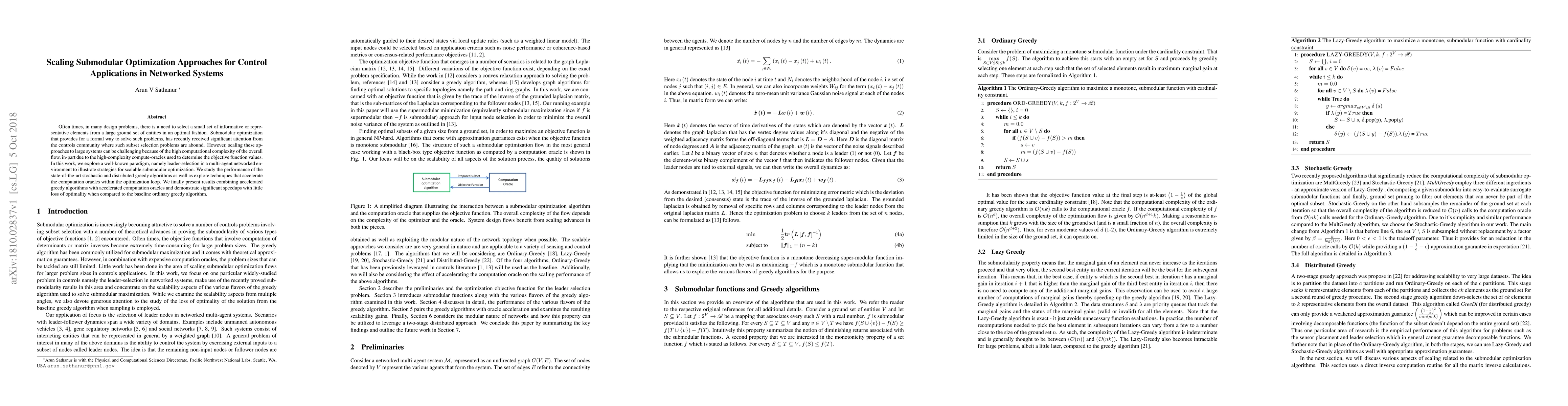 This paper investigates scalable submodular optimization for control applications in networked systems, focusing on efficient subset selection. It explores state-of-the-art stochastic and distributed greedy algorithms, and introduces techniques to accelerate computation oracles, achieving significant speedups with minimal loss of optimality.