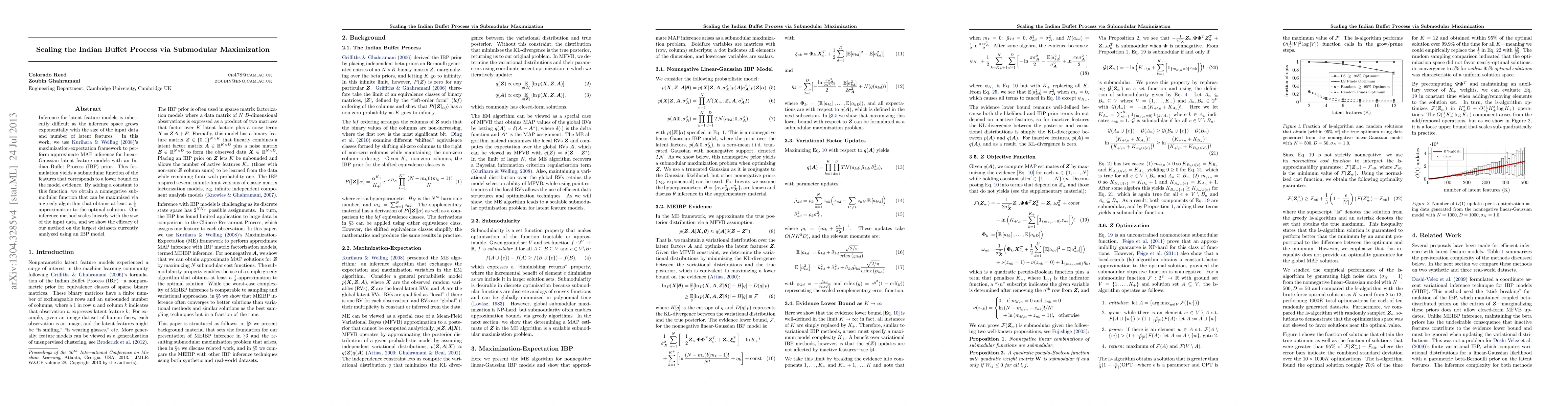 Inference for latent feature models is inherently difficult as the inference space grows exponentially with the size of the input data and number of latent features. In this work, we use Kurihara & Welling (2008)'s maximization-expectation framework to perform approximate MAP inference for linear-Gaussian latent feature models with an Indian Buffet Process (IBP) prior. This formulation yields a submodular function of the features that corresponds to a lower bound on the model evidence. By adding a constant to this function, we obtain a nonnegative submodular function that can be maximized via a greedy algorithm that obtains at least a one-third approximation to the optimal solution. Our inference method scales linearly with the size of the input data, and we show the efficacy of our method on the largest datasets currently analyzed using an IBP model.