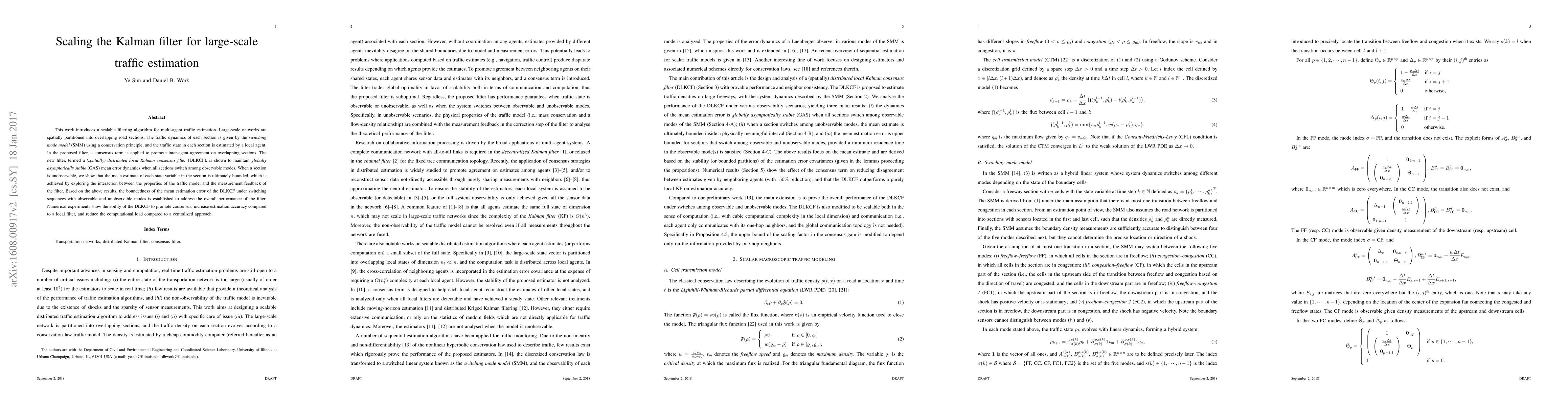This work introduces a scalable filtering algorithm for multi-agent traffic estimation. Large-scale networks are spatially partitioned into overlapping road sections. The traffic dynamics of each section is given by the switching mode model (SMM) using a conservation principle, and the traffic state in each section is estimated by a local agent. In the proposed filter, a consensus term is applied to promote inter-agent agreement on overlapping sections. The new filter, termed a (spatially) distributed local Kalman consensus filter (DLKCF), is shown to maintain globally asymptotically stable (GAS) mean error dynamics when all sections switch among observable modes. When a section is unobservable, we show that the mean estimate of each state variable in the section is ultimately bounded, which is achieved by exploring the interaction between the properties of the traffic model and the measurement feedback of the filter. Based on the above results, the boundedness of the mean estimation error of the DLKCF under switching sequences with observable and unobservable modes is established to address the overall performance of the filter. Numerical experiments show the ability of the DLKCF to promote consensus, increase estimation accuracy compared to a local filter, and reduce the computational load compared to a centralized approach.