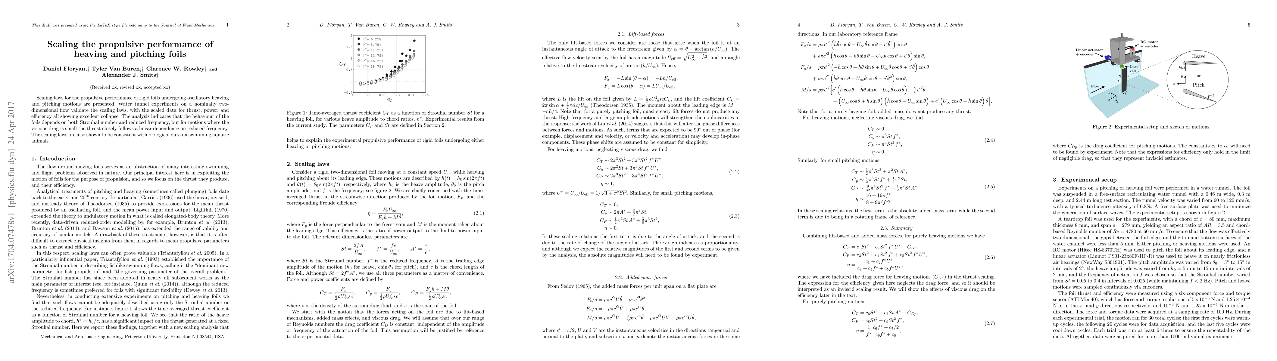 This paper presents scaling laws for the propulsive performance of rigid foils in oscillatory heaving and pitching motions, validated through water tunnel experiments. The analysis shows that thrust follows a linear dependence on reduced frequency when viscous drag is minimal, and the scaling laws align with biological data from swimming aquatic animals.