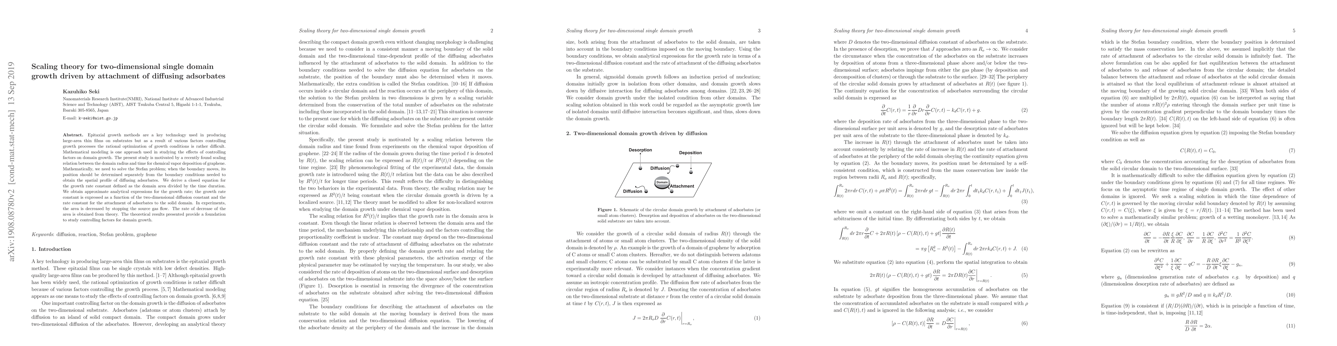 Epitaxial growth methods are a key technology used in producing large-area thin films on substrates but as a result of various factors controlling growth processes the rational optimization of growth conditions is rather difficult. Mathematical modeling is one approach used in studying the effects of controlling factors on domain growth. The present study is motivated by a recently found scaling relation between the domain radius and time for chemical vapor deposition of graphene. Mathematically, we need to solve the Stefan problem; when the boundary moves, its position should be determined separately from the boundary conditions needed to obtain the spatial profile of diffusing adsorbates. We derive a closed equation for the growth rate constant defined as the domain area divided by the time duration. We obtain approximate analytical expressions for the growth rate; the growth rate constant is expressed as a function of the two-dimensional diffusion constant and the rate constant for the attachment of adsorbates to the solid domain. In experiments, the area is decreased by stopping the source gas flow. The rate of decrease of the area is obtained from theory. The theoretical results presented provide a foundation to study controlling factors for domain growth.