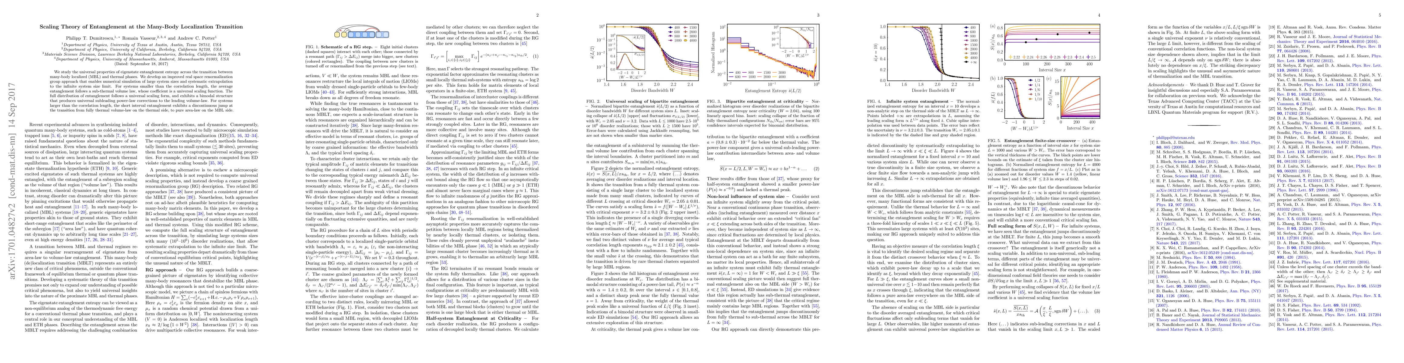 We study the universal properties of eigenstate entanglement entropy across the transition between many-body localized (MBL) and thermal phases. We develop an improved real space renormalization group approach that enables numerical simulation of large system sizes and systematic extrapolation to the infinite system size limit. For systems smaller than the correlation length, the average entanglement follows a sub-thermal volume law, whose coefficient is a universal scaling function. Furthermore, the full distribution of entanglement follows a universal scaling form, and exhibits a bimodal structure that produces universal subleading power-law corrections to the leading volume-law. For systems larger than the correlation length, the short interval entanglement exhibits a discontinuous jump across the transition from fully thermal volume-law on the thermal side, to a pure area-law on the MBL side.