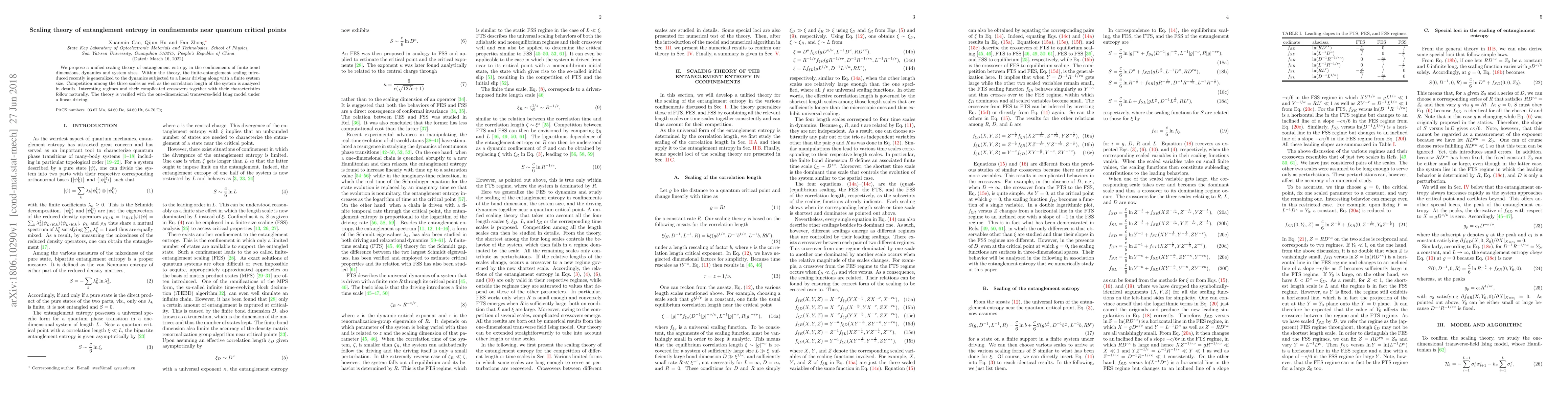 This paper proposes a unified scaling theory for entanglement entropy in confined systems near quantum critical points, generalizing finite-entanglement scaling to dynamic systems with linear driving and finite sizes. The theory analyzes competition among scales and correlation lengths, verified through the one-dimensional transverse-field Ising model.