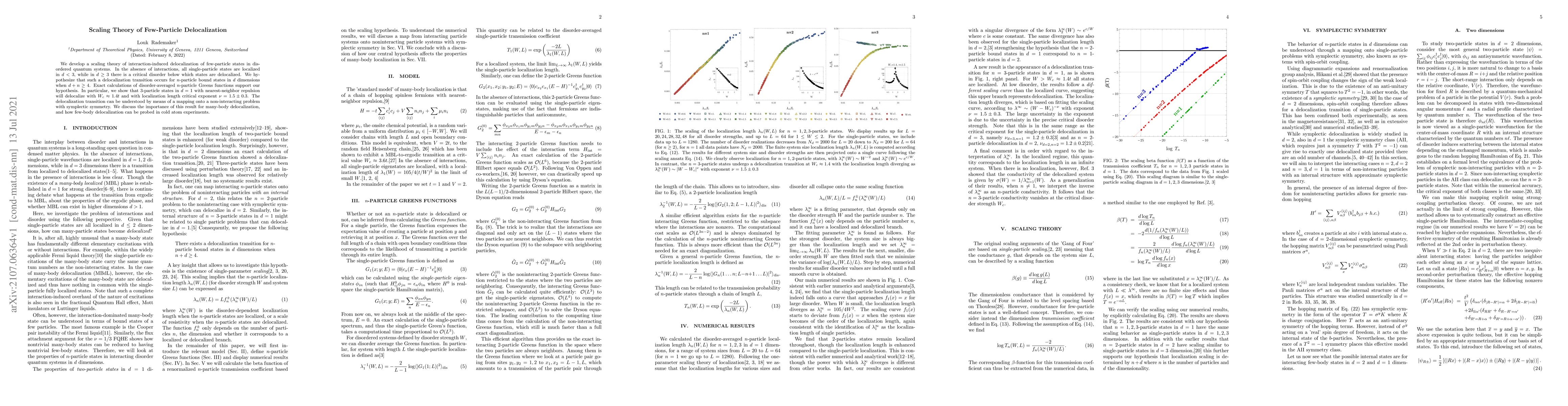 This paper develops a scaling theory for interaction-induced delocalization of few-particle states in disordered quantum systems, proposing a critical transition for $n$-particle states when $d+n\geq 4$. Exact calculations support the hypothesis, showing that $3$-particle states in $d=1$ with repulsion delocalize with a critical disorder value and specific exponent.