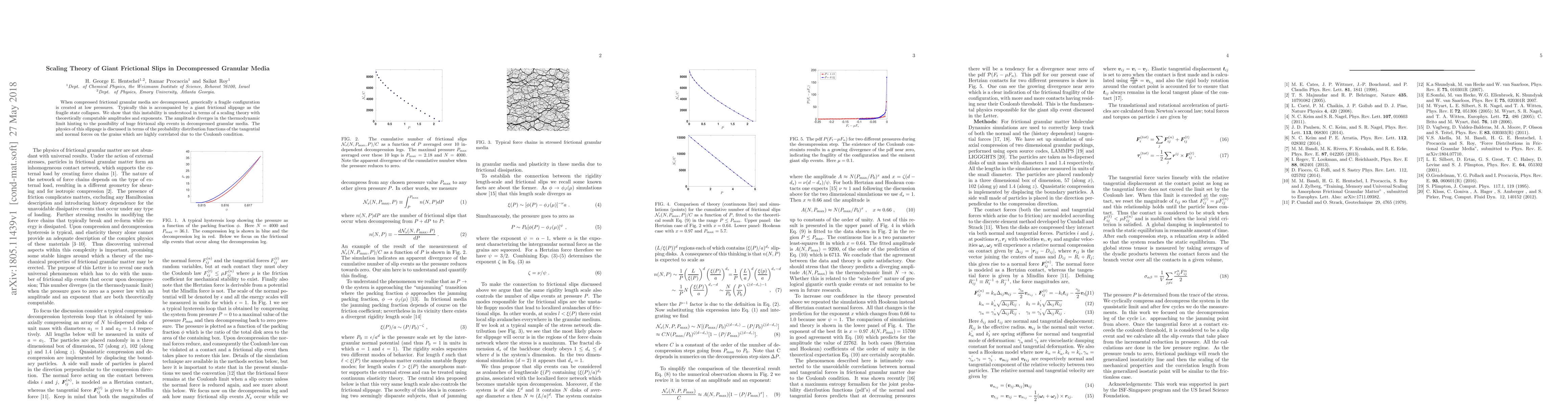 This paper presents a scaling theory explaining the phenomenon of giant frictional slips in decompressed granular media, showing that the instability is characterized by theoretically computable amplitudes and exponents, with the amplitude diverging in the thermodynamic limit, suggesting potential for significant frictional slip events. The study also discusses the physics through the correlated probability distribution functions of tangential and normal forces on grains.