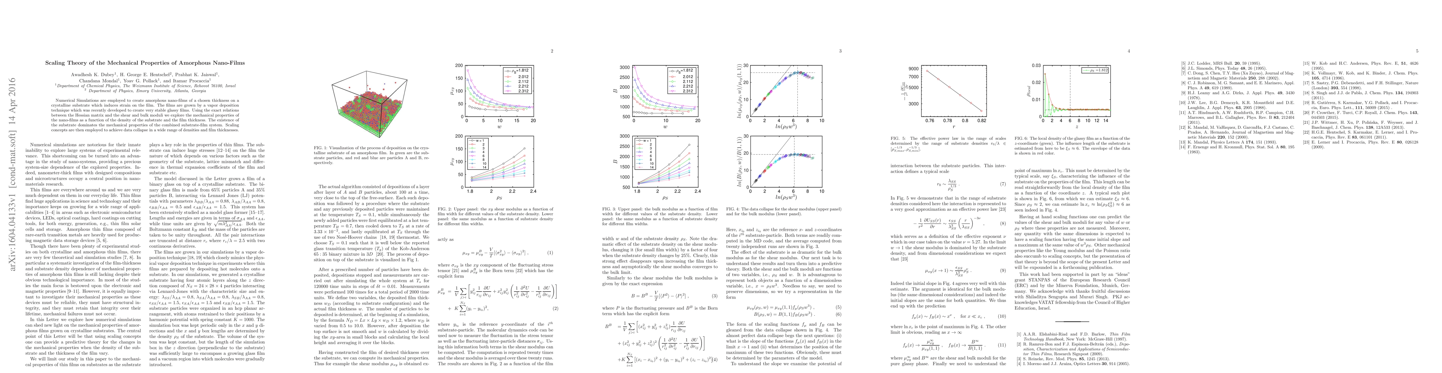 This paper uses numerical simulations to study the mechanical properties of amorphous nano-films grown on crystalline substrates under strain, revealing that substrate density and film thickness significantly influence these properties. The study employs scaling theory to achieve data collapse across various densities and thicknesses.