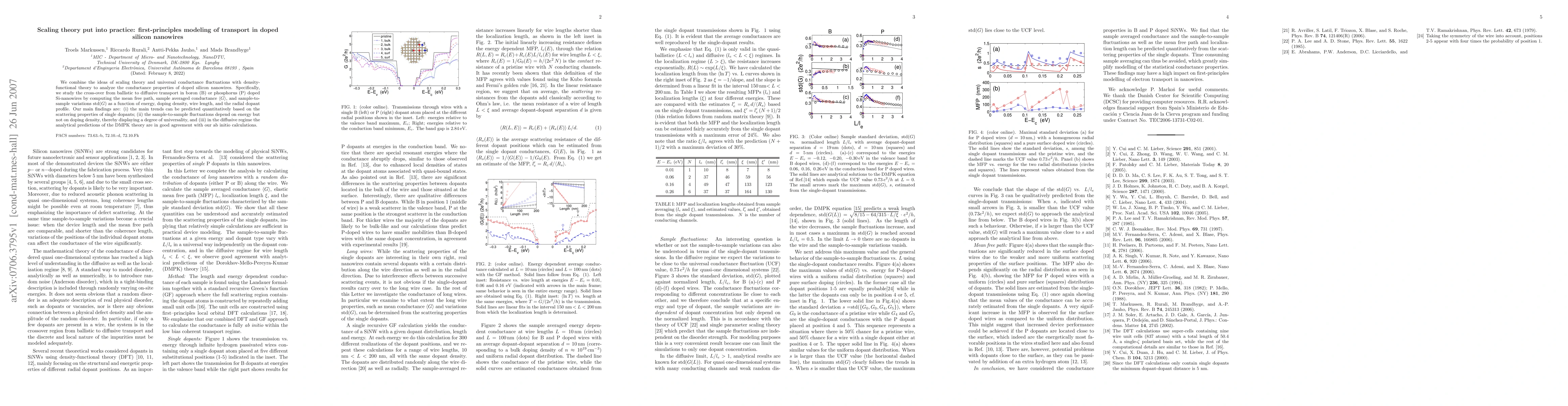 This study merges scaling theory and density-functional theory to analyze doped silicon nanowire conductance. Key findings include predictable trends based on dopant scattering, energy-dependent but doping-independent fluctuations, and DMPK theory agreement in the diffusive regime.