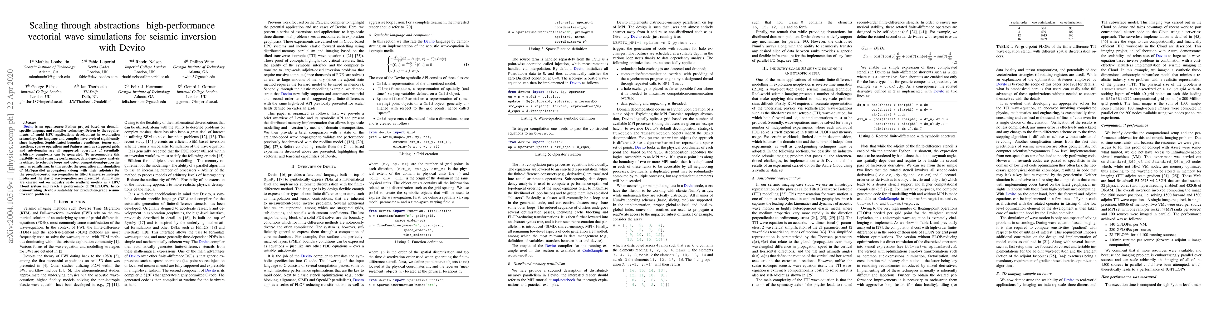 [Devito] is an open-source Python project based on domain-specific language and compiler technology. Driven by the requirements of rapid HPC applications development in exploration seismology, the language and compiler have evolved significantly since inception. Sophisticated boundary conditions, tensor contractions, sparse operations and features such as staggered grids and sub-domains are all supported; operators of essentially arbitrary complexity can be generated. To accommodate this flexibility whilst ensuring performance, data dependency analysis is utilized to schedule loops and detect computational-properties such as parallelism. In this article, the generation and simulation of MPI-parallel propagators (along with their adjoints) for the pseudo-acoustic wave-equation in tilted transverse isotropic media and the elastic wave-equation are presented. Simulations are carried out on industry scale synthetic models in a HPC Cloud system and reach a performance of 28TFLOP/s, hence demonstrating Devito's suitability for production-grade seismic inversion problems.