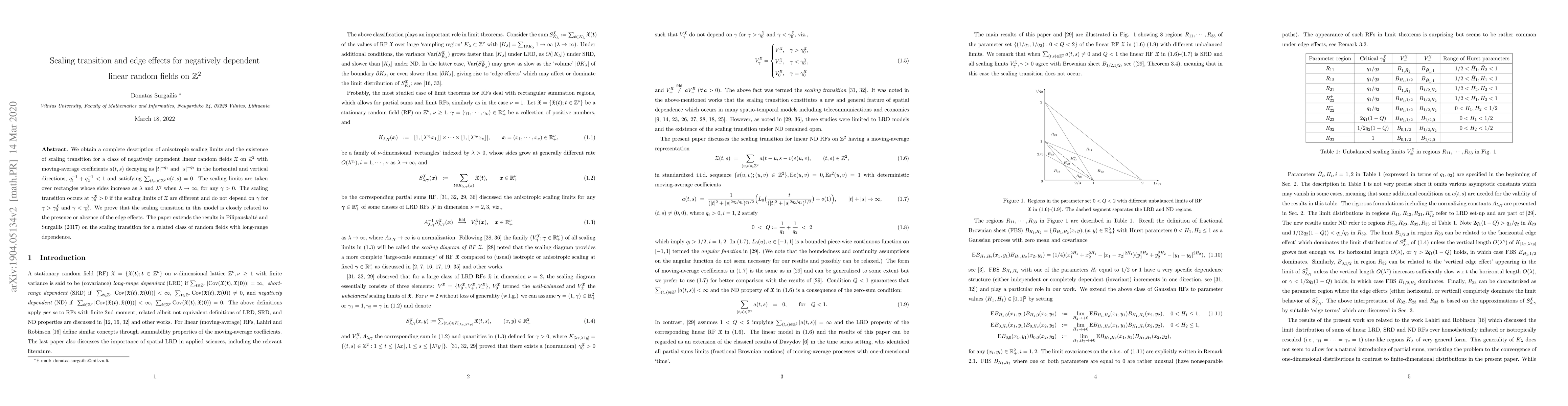 We obtain a complete description of anisotropic scaling limits and the existence of scaling transition for a class of negatively dependent linear random fields on ${\mathbb{Z}}^2$ with moving-average coefficients $a(t,s)$ decaying as $|t|^{-q_1}$ and $|s|^{-q_2}$ in the horizontal and vertical directions, $q_1^{-1} + q_2^{-1} < 1 $. The scaling limits are taken over rectangles whose sides increase as $\lambda $ and $\lambda^\gamma $ when $\lambda \to \infty$, for any $\gamma >0$. We prove that the scaling transition %and the structure of the scaling diagram in this model is closely related to the presence or absence of the edge effects.