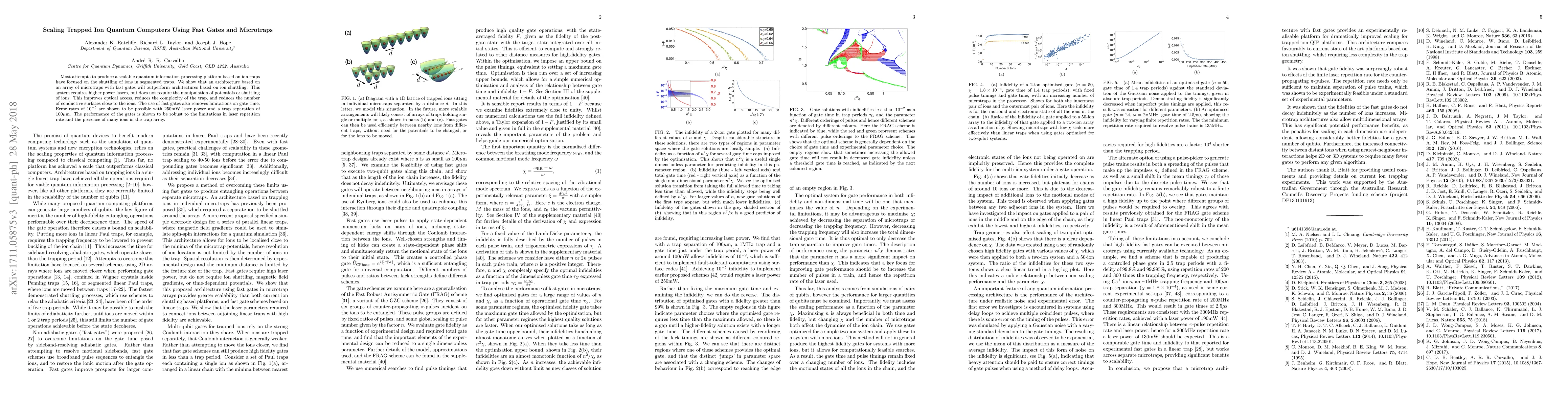 This paper proposes a scalable architecture for trapped ion quantum computers using an array of microtraps with fast gates, which outperforms ion shuttling methods by improving optical access, reducing trap complexity, and eliminating limitations on gate time. The approach requires higher power lasers but does not necessitate ion manipulation or potential adjustments.