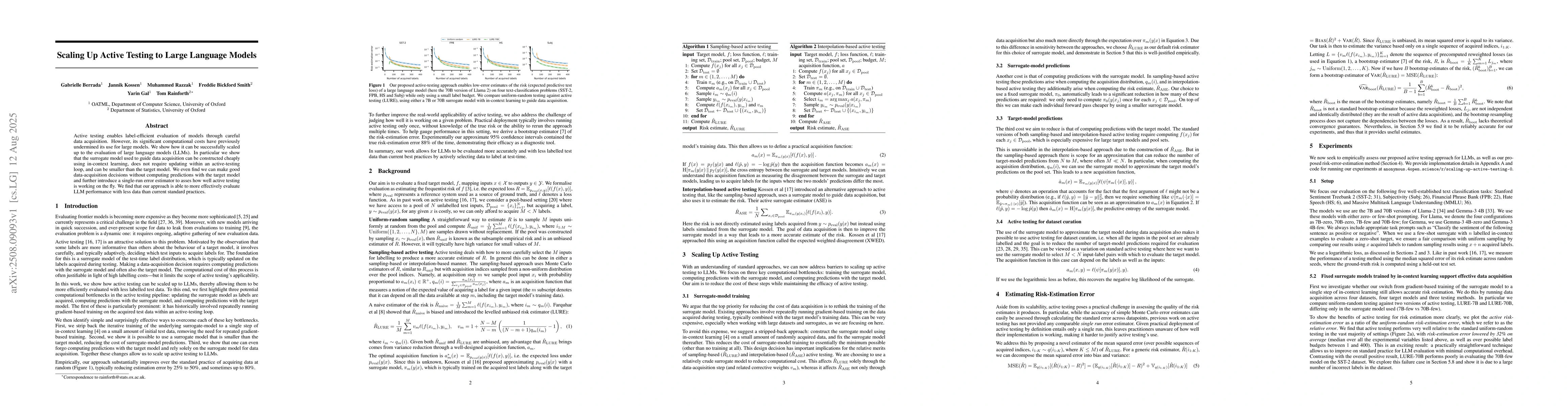 Active testing enables label-efficient evaluation of models through careful data acquisition. However, its significant computational costs have previously undermined its use for large models. We show how it can be successfully scaled up to the evaluation of large language models (LLMs). In particular we show that the surrogate model used to guide data acquisition can be constructed cheaply using in-context learning, does not require updating within an active-testing loop, and can be smaller than the target model. We even find we can make good data-acquisition decisions without computing predictions with the target model and further introduce a single-run error estimator to asses how well active testing is working on the fly. We find that our approach is able to more effectively evaluate LLM performance with less data than current standard practices.
