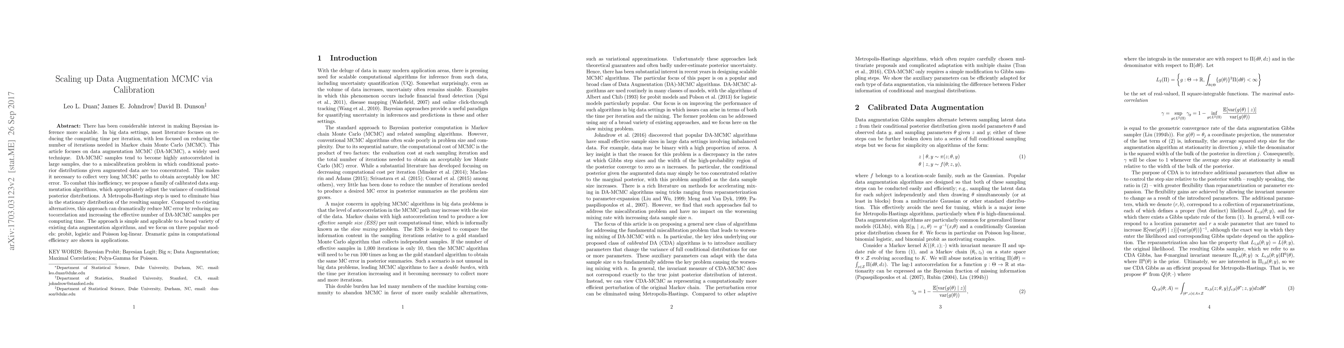 This paper proposes calibrated data augmentation techniques to enhance the scalability of Bayesian inference in big data settings by reducing the number of iterations needed in Markov chain Monte Carlo (MCMC). The method addresses the miscalibration issue in data augmentation MCMC, which leads to high autocorrelation in samples, by adjusting the variance of conditional posterior distributions, thereby significantly reducing Monte Carlo error and improving computational efficiency.
