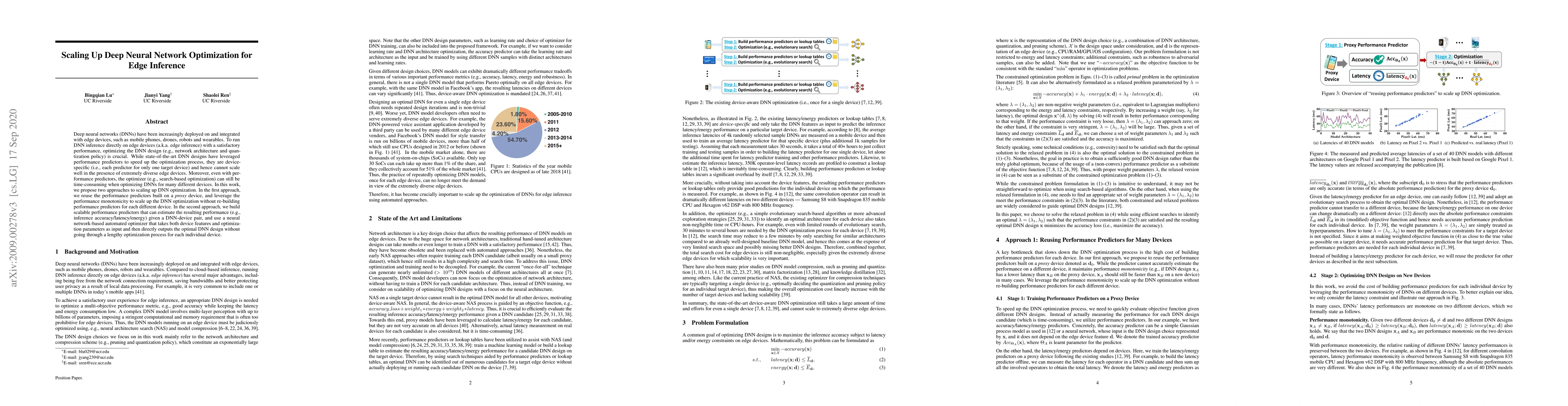 This paper proposes two methods to optimize deep neural networks (DNNs) for edge inference across diverse devices. The first method reuses performance predictors from a proxy device, leveraging monotonicity to scale optimization. The second method introduces scalable performance predictors, combined with a neural network-based optimizer to directly output optimal DNN designs without lengthy individual device optimizations.