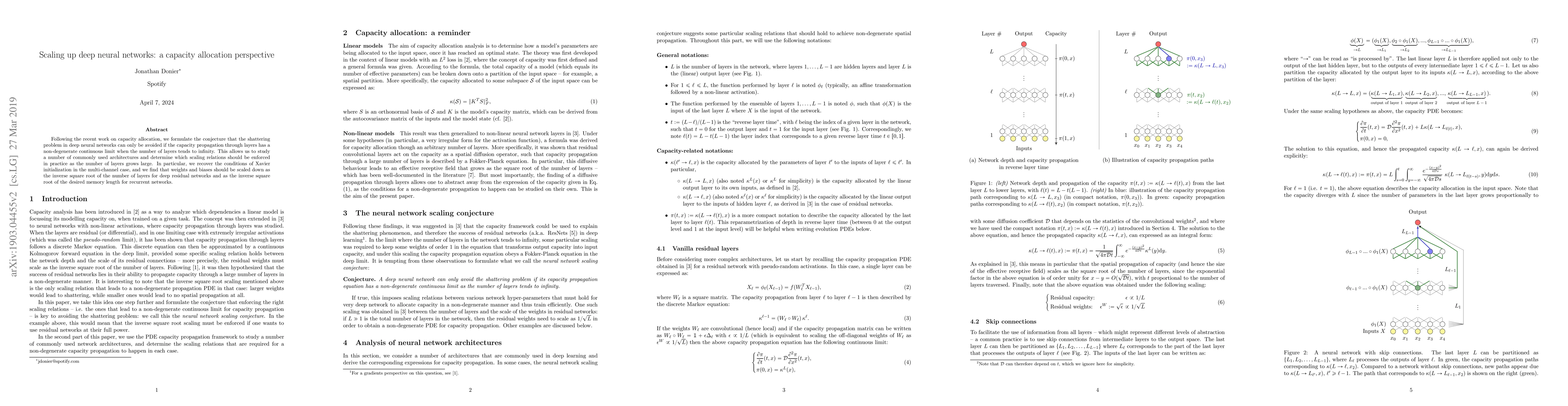 Following the recent work on capacity allocation, we formulate the conjecture that the shattering problem in deep neural networks can only be avoided if the capacity propagation through layers has a non-degenerate continuous limit when the number of layers tends to infinity. This allows us to study a number of commonly used architectures and determine which scaling relations should be enforced in practice as the number of layers grows large. In particular, we recover the conditions of Xavier initialization in the multi-channel case, and we find that weights and biases should be scaled down as the inverse square root of the number of layers for deep residual networks and as the inverse square root of the desired memory length for recurrent networks.