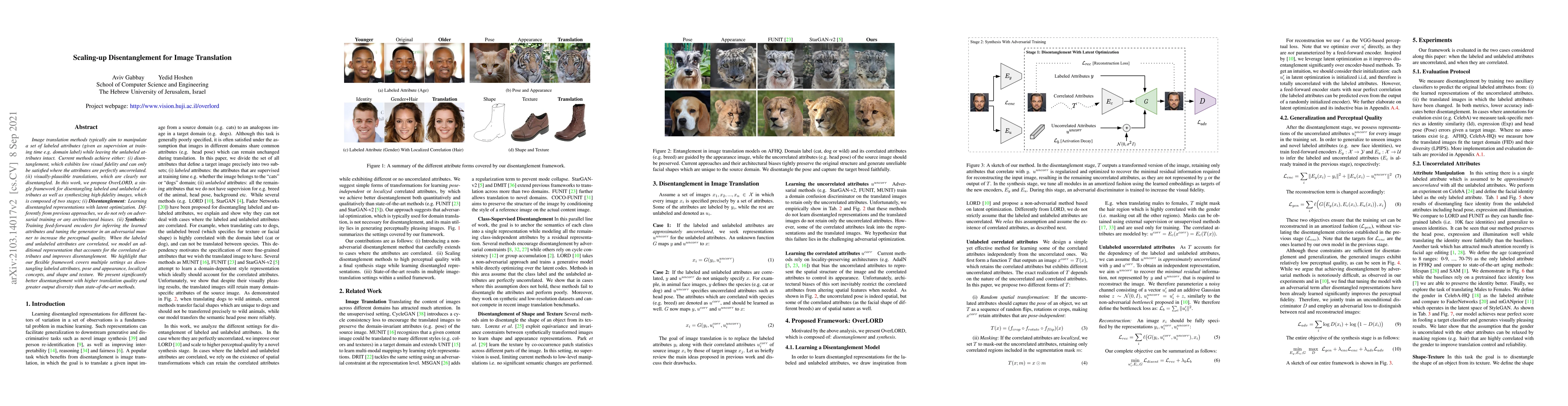 Image translation methods typically aim to manipulate a set of labeled attributes (given as supervision at training time e.g. domain label) while leaving the unlabeled attributes intact. Current methods achieve either: (i) disentanglement, which exhibits low visual fidelity and can only be satisfied where the attributes are perfectly uncorrelated. (ii) visually-plausible translations, which are clearly not disentangled. In this work, we propose OverLORD, a single framework for disentangling labeled and unlabeled attributes as well as synthesizing high-fidelity images, which is composed of two stages; (i) Disentanglement: Learning disentangled representations with latent optimization. Differently from previous approaches, we do not rely on adversarial training or any architectural biases. (ii) Synthesis: Training feed-forward encoders for inferring the learned attributes and tuning the generator in an adversarial manner to increase the perceptual quality. When the labeled and unlabeled attributes are correlated, we model an additional representation that accounts for the correlated attributes and improves disentanglement. We highlight that our flexible framework covers multiple settings as disentangling labeled attributes, pose and appearance, localized concepts, and shape and texture. We present significantly better disentanglement with higher translation quality and greater output diversity than state-of-the-art methods.