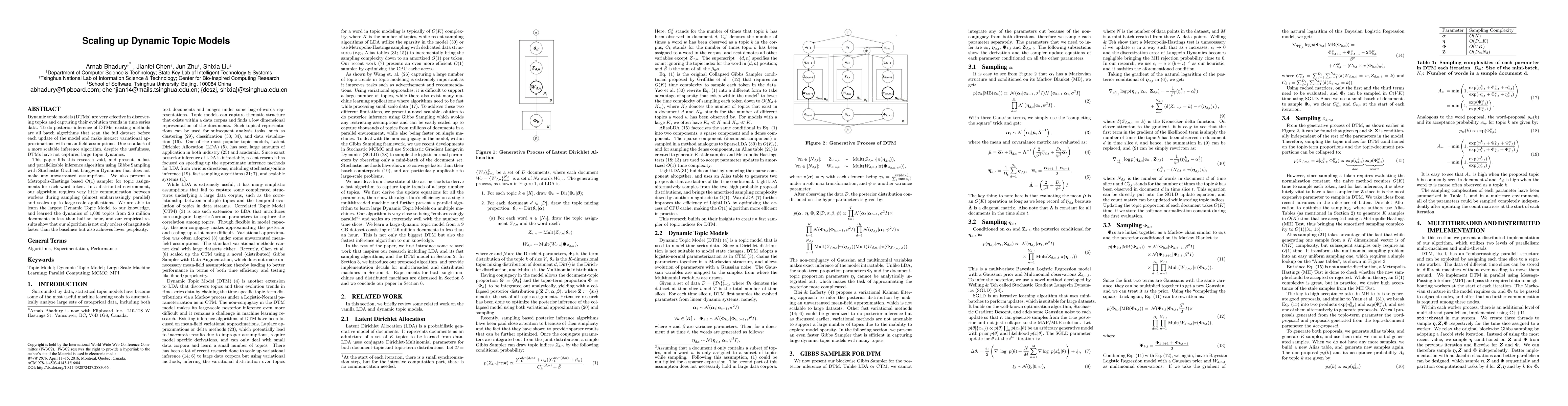 This paper introduces a scalable inference algorithm for Dynamic Topic Models (DTMs) using Gibbs Sampling with Stochastic Gradient Langevin Dynamics, enabling parallel processing and reducing communication overhead. The proposed method achieves significant speedups and lower perplexity compared to existing batch algorithms, allowing the analysis of 1,000 topics from 2.6 million documents in under 30 minutes.