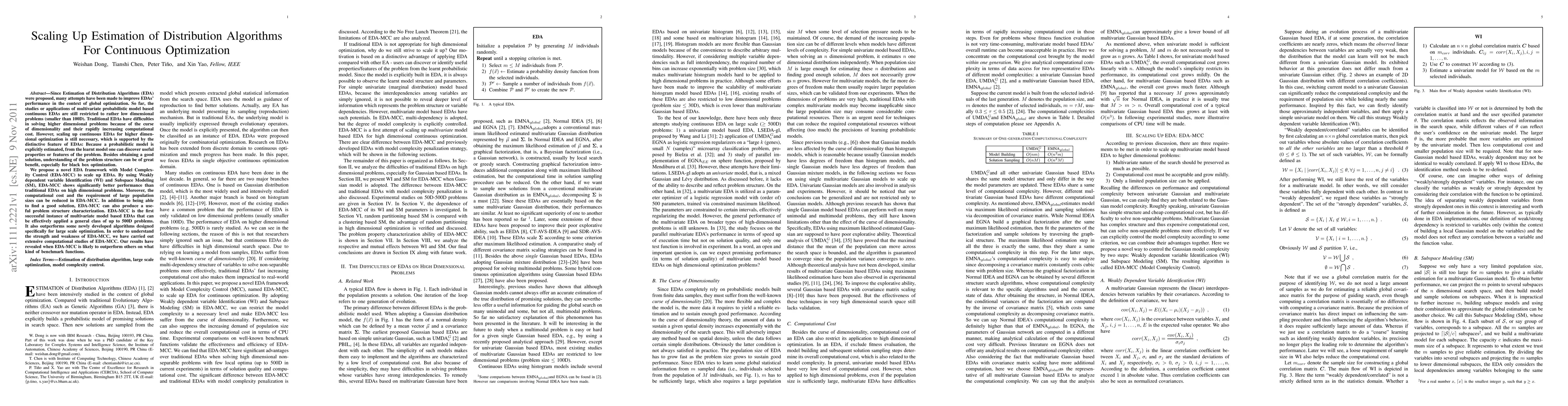 Since Estimation of Distribution Algorithms (EDA) were proposed, many attempts have been made to improve EDAs' performance in the context of global optimization. So far, the studies or applications of multivariate probabilistic model based continuous EDAs are still restricted to rather low dimensional problems (smaller than 100D). Traditional EDAs have difficulties in solving higher dimensional problems because of the curse of dimensionality and their rapidly increasing computational cost. However, scaling up continuous EDAs for higher dimensional optimization is still necessary, which is supported by the distinctive feature of EDAs: Because a probabilistic model is explicitly estimated, from the learnt model one can discover useful properties or features of the problem. Besides obtaining a good solution, understanding of the problem structure can be of great benefit, especially for black box optimization. We propose a novel EDA framework with Model Complexity Control (EDA-MCC) to scale up EDAs. By using Weakly dependent variable Identification (WI) and Subspace Modeling (SM), EDA-MCC shows significantly better performance than traditional EDAs on high dimensional problems. Moreover, the computational cost and the requirement of large population sizes can be reduced in EDA-MCC. In addition to being able to find a good solution, EDA-MCC can also produce a useful problem structure characterization. EDA-MCC is the first successful instance of multivariate model based EDAs that can be effectively applied a general class of up to 500D problems. It also outperforms some newly developed algorithms designed specifically for large scale optimization. In order to understand the strength and weakness of EDA-MCC, we have carried out extensive computational studies of EDA-MCC. Our results have revealed when EDA-MCC is likely to outperform others on what kind of benchmark functions.