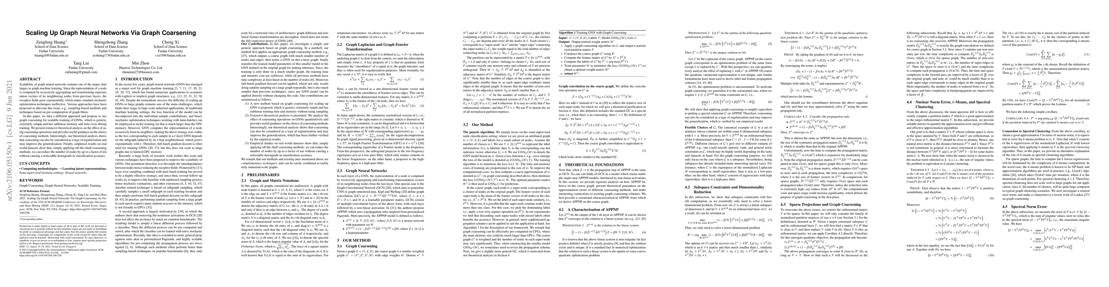 This paper proposes graph coarsening as a scalable training method for graph neural networks (GNNs), demonstrating sublinear memory and time costs. Theoretical analysis suggests that coarsening acts as a form of regularization, potentially improving generalization, and empirical results show significant reduction in nodes without compromising classification accuracy.