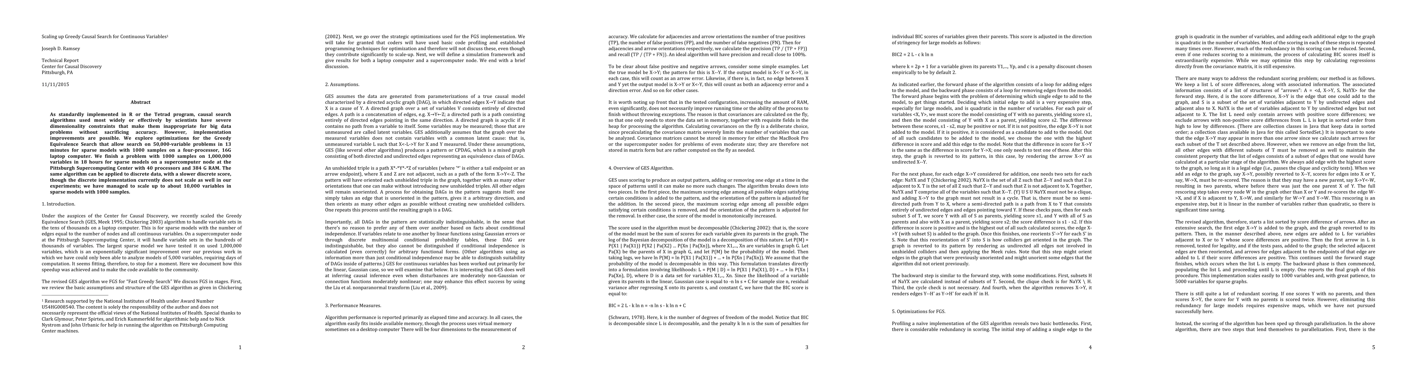 As standardly implemented in R or the Tetrad program, causal search algorithms used most widely or effectively by scientists have severe dimensionality constraints that make them inappropriate for big data problems without sacrificing accuracy. However, implementation improvements are possible. We explore optimizations for the Greedy Equivalence Search that allow search on 50,000-variable problems in 13 minutes for sparse models with 1000 samples on a four-processor, 16G laptop computer. We finish a problem with 1000 samples on 1,000,000 variables in 18 hours for sparse models on a supercomputer node at the Pittsburgh Supercomputing Center with 40 processors and 384 G RAM. The same algorithm can be applied to discrete data, with a slower discrete score, though the discrete implementation currently does not scale as well in our experiments; we have managed to scale up to about 10,000 variables in sparse models with 1000 samples.