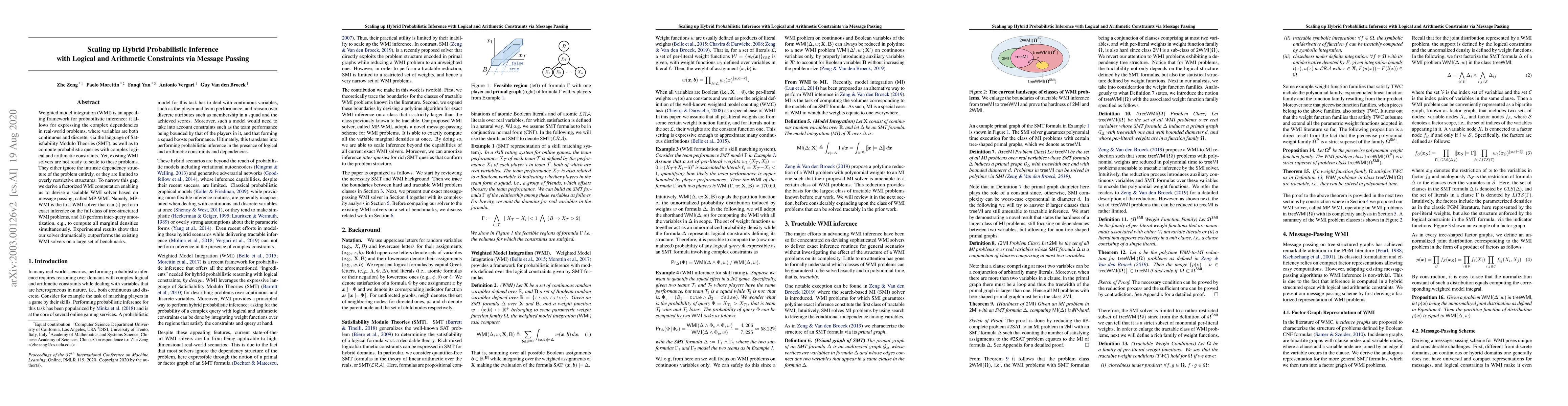 This paper proposes a scalable solver, MP-WMI, for weighted model integration (WMI) that leverages message passing to handle complex logical and arithmetic constraints in hybrid probabilistic inference. It achieves exact inference for tree-structured WMI problems, computes marginal densities in linear time, and demonstrates significant performance improvements over existing WMI solvers in experimental benchmarks.
