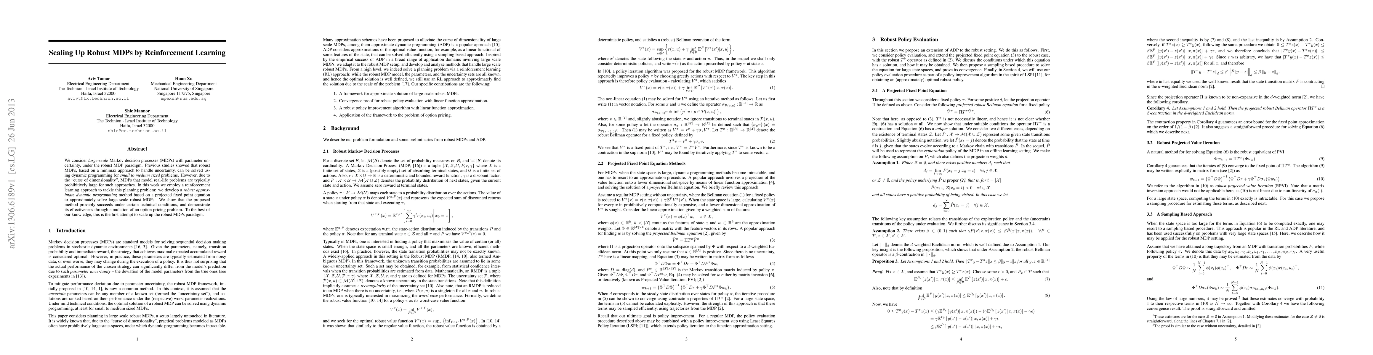 We consider large-scale Markov decision processes (MDPs) with parameter uncertainty, under the robust MDP paradigm. Previous studies showed that robust MDPs, based on a minimax approach to handle uncertainty, can be solved using dynamic programming for small to medium sized problems. However, due to the "curse of dimensionality", MDPs that model real-life problems are typically prohibitively large for such approaches. In this work we employ a reinforcement learning approach to tackle this planning problem: we develop a robust approximate dynamic programming method based on a projected fixed point equation to approximately solve large scale robust MDPs. We show that the proposed method provably succeeds under certain technical conditions, and demonstrate its effectiveness through simulation of an option pricing problem. To the best of our knowledge, this is the first attempt to scale up the robust MDPs paradigm.