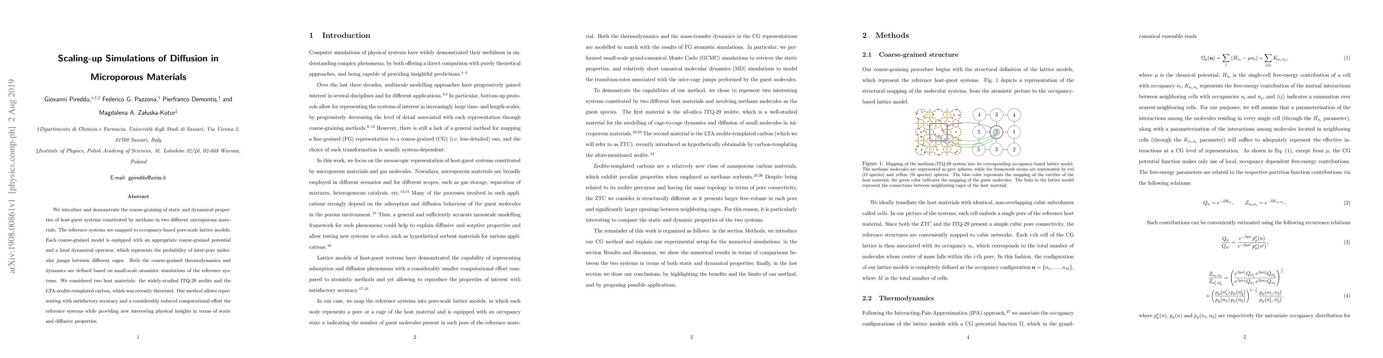 We introduce and demonstrate the coarse-graining of static and dynamical properties of host-guest systems constituted by methane in two different microporous materials. The reference systems are mapped to occupancy-based pore-scale lattice models. Each coarse-grained model is equipped with an appropriate coarse-grained potential and a local dynamical operator, which represents the probability of inter-pore molecular jumps between different cages. Both the coarse-grained thermodynamics and dynamics are defined based on small-scale atomistic simulations of the reference systems. We considered two host materials: the widely-studied ITQ-29 zeolite and the LTA-zeolite-templated carbon, which was recently theorized. Our method allows representing with satisfactory accuracy and a considerably reduced computational effort the reference systems while providing new interesting physical insights in terms of static and diffusive properties.
