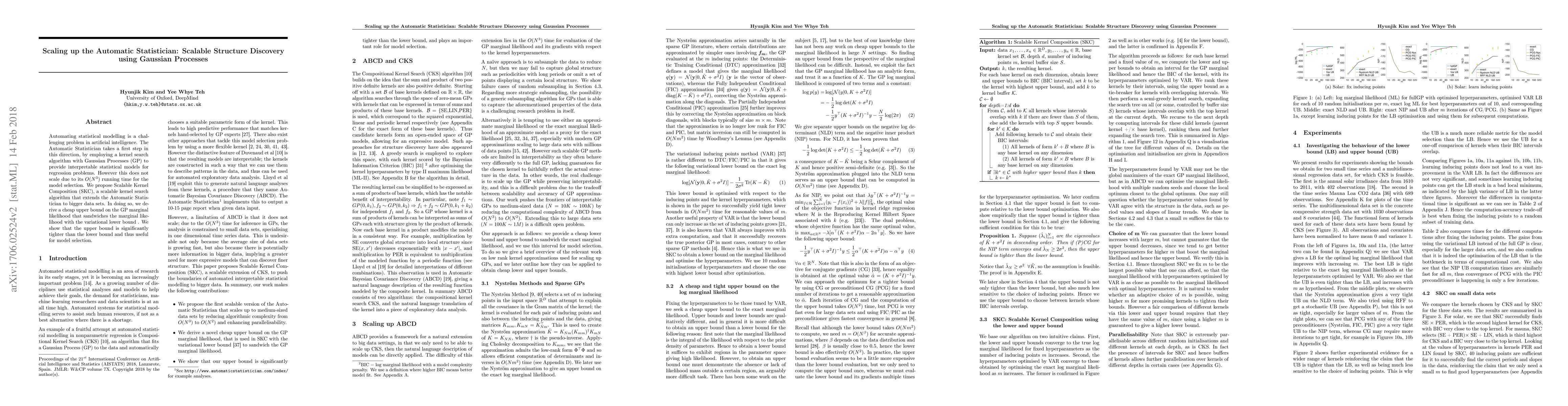 This paper proposes Scalable Kernel Composition (SKC) to extend the Automatic Statistician's kernel search algorithm using Gaussian Processes for scalable structure discovery in large datasets. It introduces a tighter upper bound on the GP marginal likelihood, improving model selection efficiency over traditional $O(N^3)$ methods.