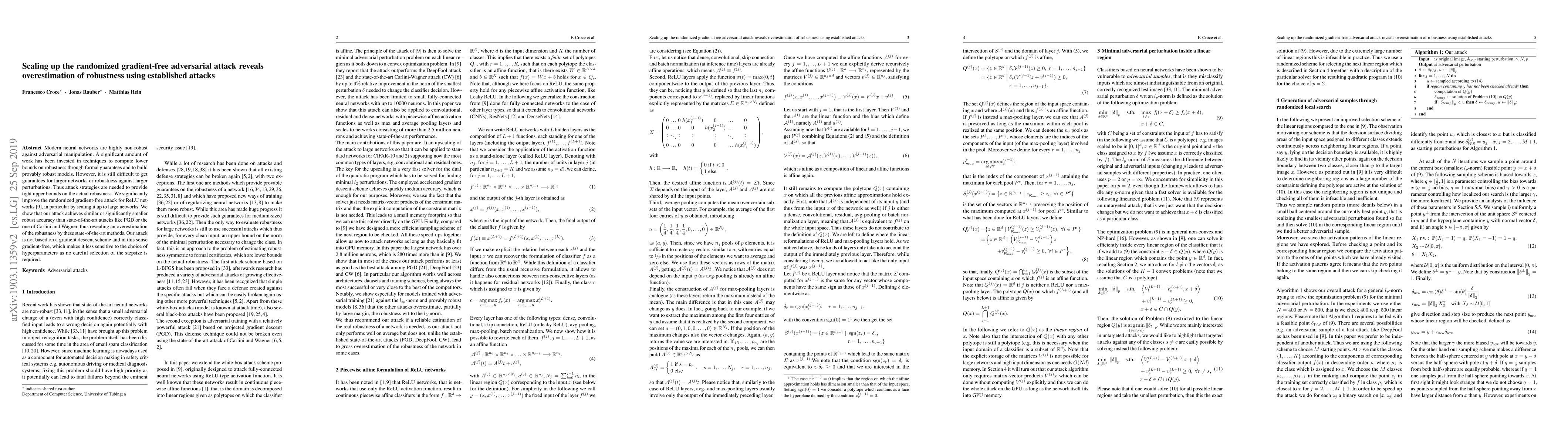 This paper enhances a randomized gradient-free adversarial attack on ReLU networks, demonstrating its effectiveness on large networks. It reveals that established attacks overestimate neural network robustness, as the proposed attack achieves comparable or superior performance against state-of-the-art methods.