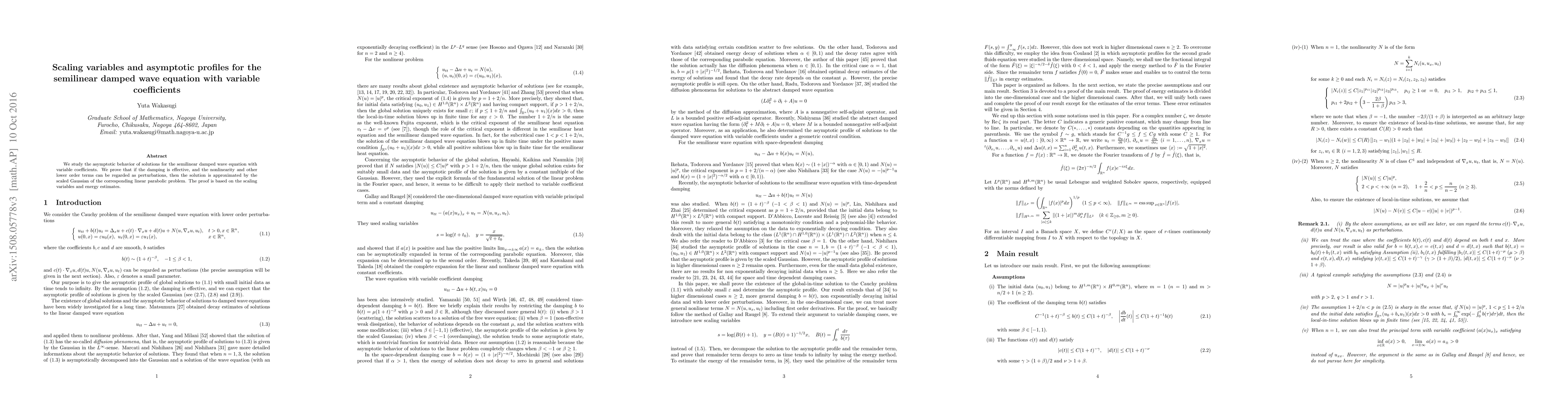 We study the asymptotic behavior of solutions for the semilinear damped wave equation with variable coefficients. We prove that if the damping is effective, and the nonlinearity and other lower order terms can be regarded as perturbations, then the solution is approximated by the scaled Gaussian of the corresponding linear parabolic problem. The proof is based on the scaling variables and energy estimates.