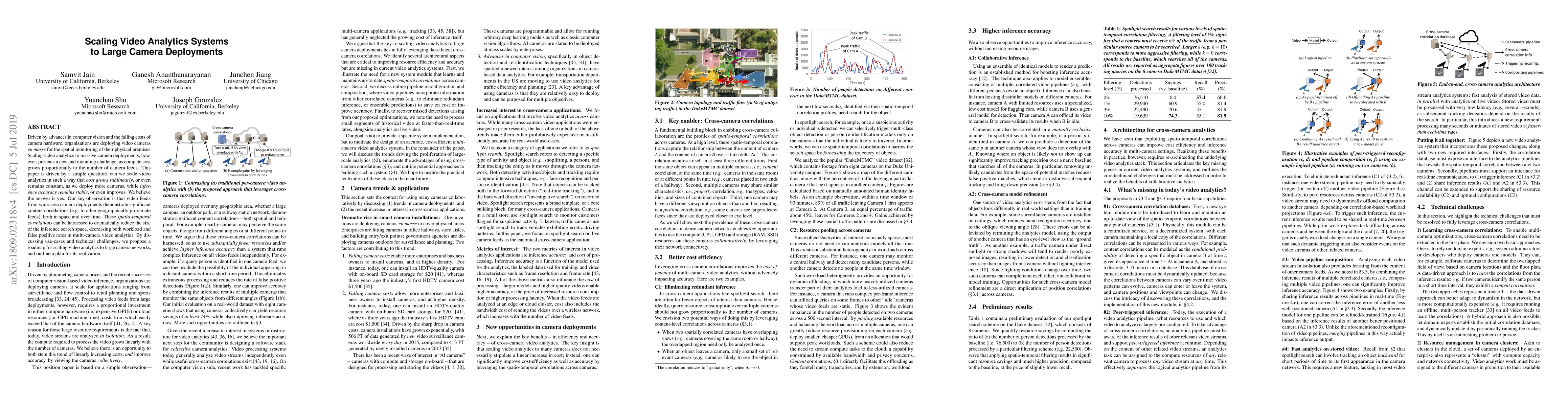 This paper explores strategies for scaling video analytics systems to large camera deployments, focusing on reducing compute costs while maintaining or improving inference accuracy. It proposes leveraging spatio-temporal correlations in video feeds to decrease the inference search space, thereby achieving sublinear cost growth with increased camera deployment.