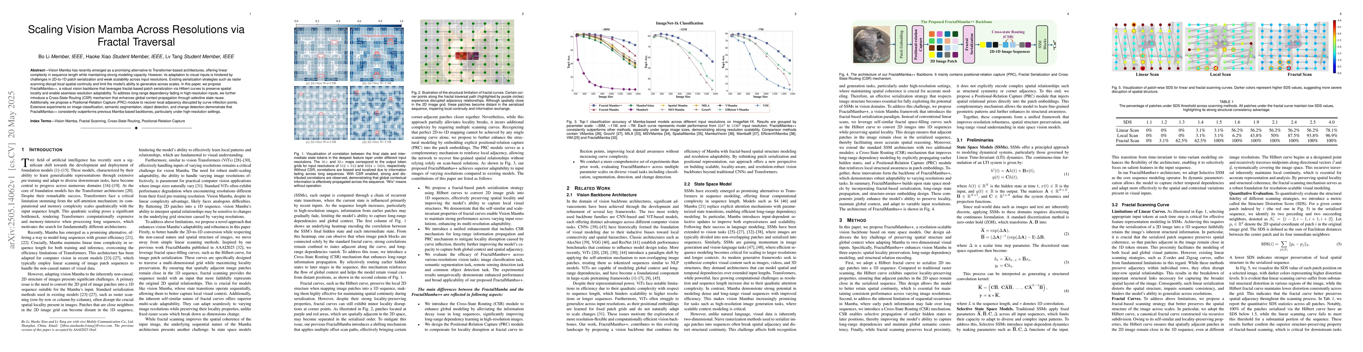 The main technical contribution is the development of FractalMamba++, a robust vision backbone that incorporates fractal-based patch serialization, Cross-State Routing (CSR), and Positional-Relation Capture (PRC) modules to improve scalability and performance in handling high-resolution visual inputs.