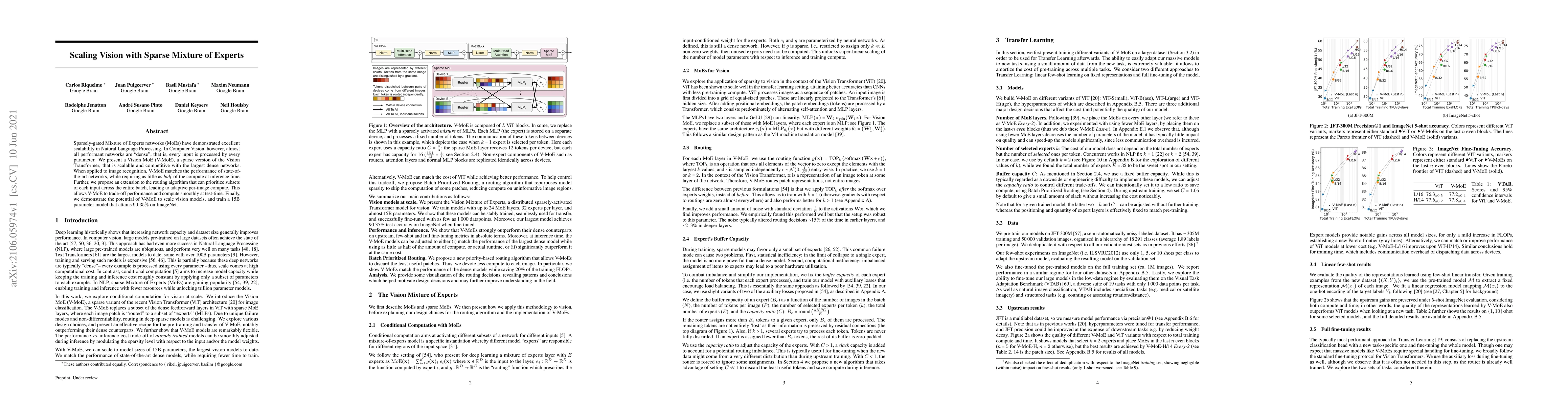 Sparsely-gated Mixture of Experts networks (MoEs) have demonstrated excellent scalability in Natural Language Processing. In Computer Vision, however, almost all performant networks are "dense", that is, every input is processed by every parameter. We present a Vision MoE (V-MoE), a sparse version of the Vision Transformer, that is scalable and competitive with the largest dense networks. When applied to image recognition, V-MoE matches the performance of state-of-the-art networks, while requiring as little as half of the compute at inference time. Further, we propose an extension to the routing algorithm that can prioritize subsets of each input across the entire batch, leading to adaptive per-image compute. This allows V-MoE to trade-off performance and compute smoothly at test-time. Finally, we demonstrate the potential of V-MoE to scale vision models, and train a 15B parameter model that attains 90.35% on ImageNet.