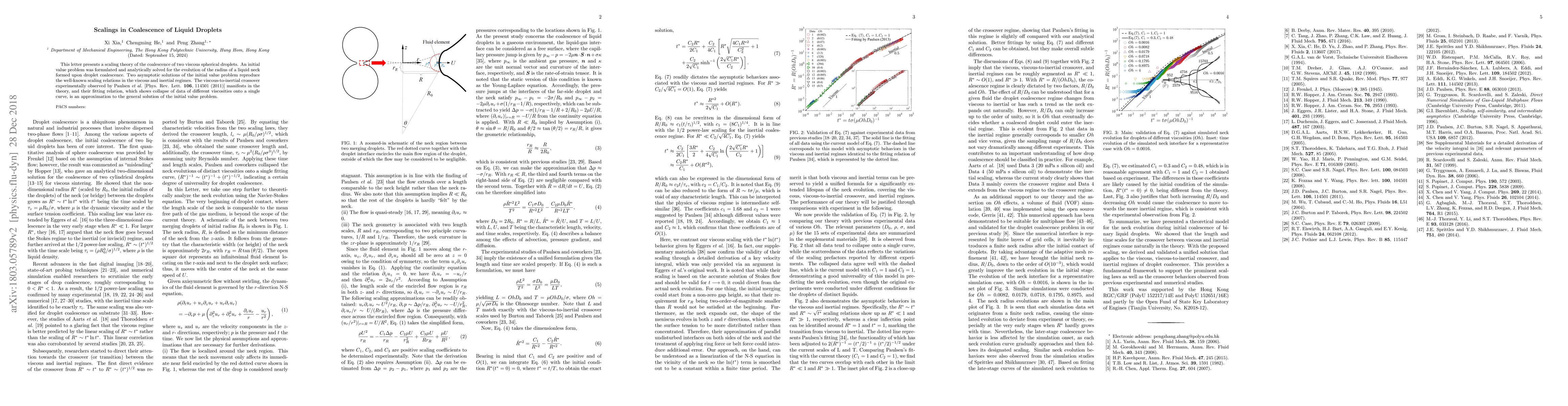 This paper develops a scaling theory for the coalescence of two viscous spherical droplets, analytically solving an initial value problem to describe the formation of a liquid neck. The theory captures the viscous and inertial regimes and reproduces the crossover behavior observed experimentally.