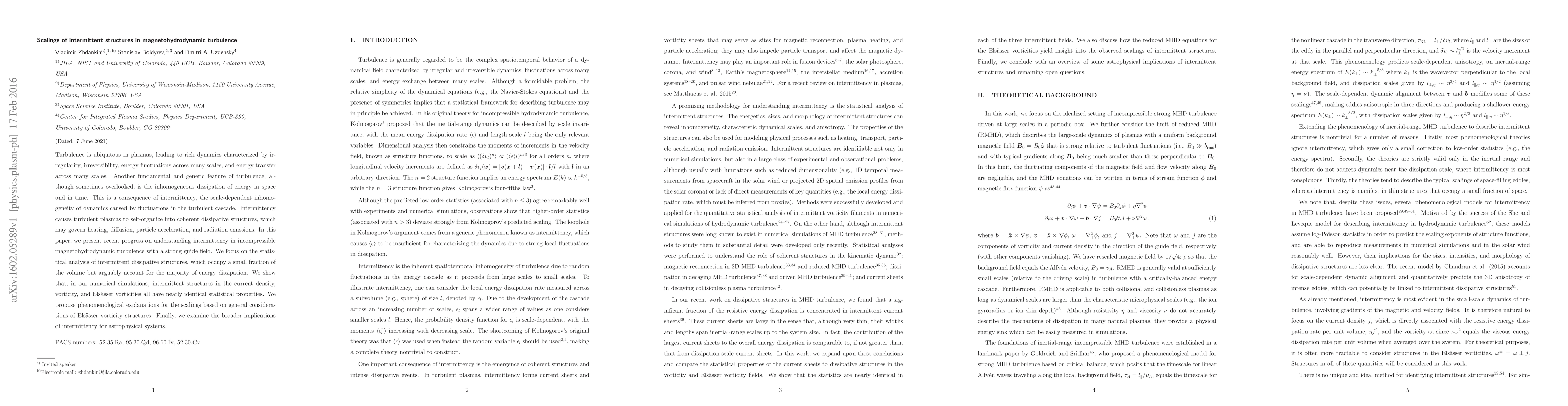 The research employs numerical simulations of incompressible magnetohydrodynamic (MHD) turbulence with a strong guide field to study intermittent dissipative structures.