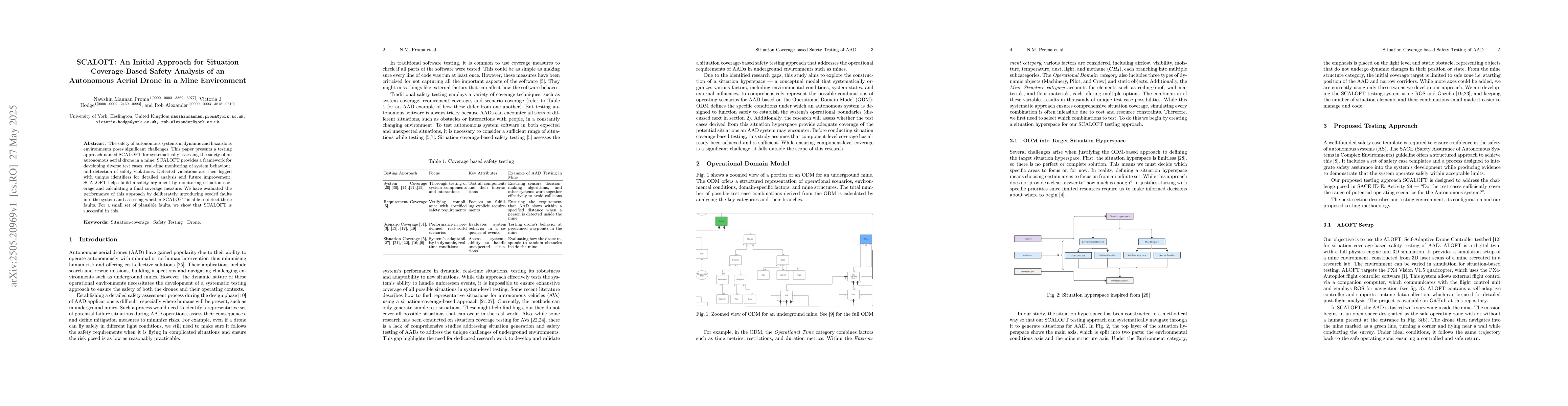 The paper presents SCALOFT, a framework for systematically assessing the safety of an autonomous aerial drone in a mine environment. It involves developing diverse test cases, real-time monitoring of system behavior, and detection of safety violations with unique identifiers for detailed analysis.