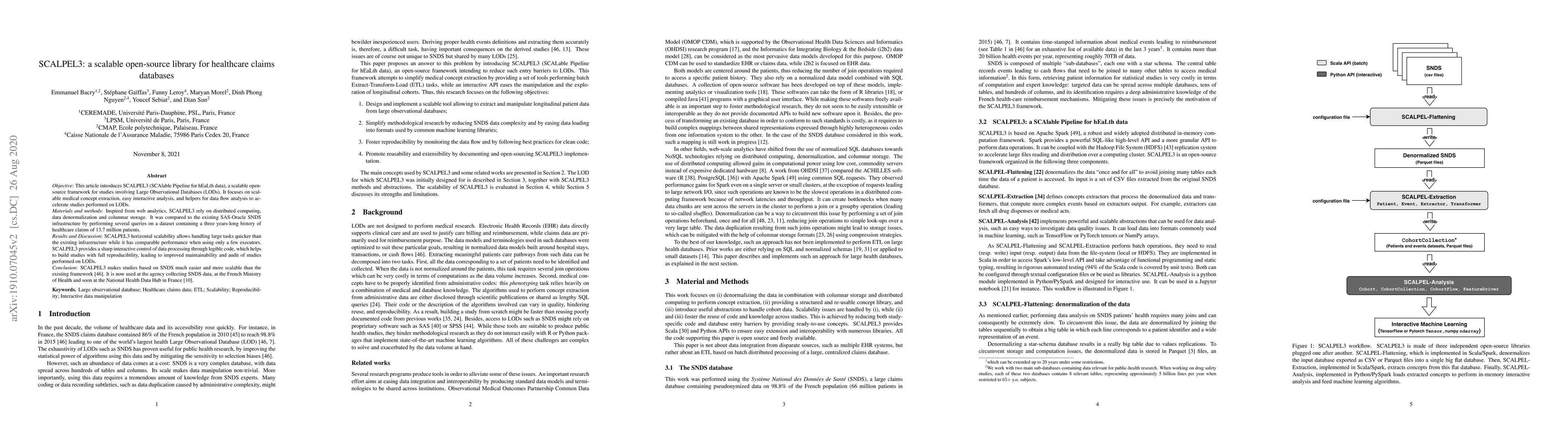 SCALPEL3 is a scalable open-source framework designed to facilitate medical observational studies using large healthcare claims databases. It comprises three libraries based on Apache Spark for data denormalization, concept extraction, and interactive cohort analysis, enabling efficient and reproducible research.