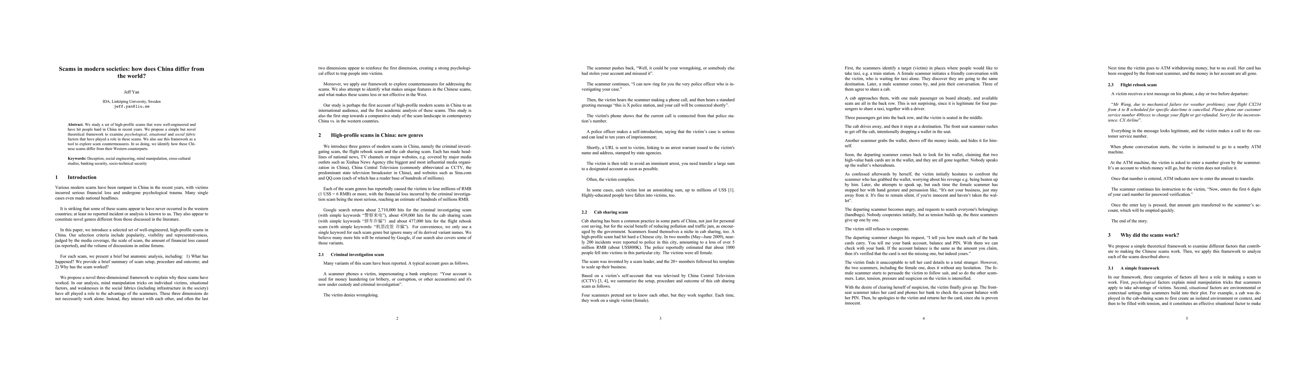 We study a set of high-profile scams that were well engineered and have hit people hard in China in recent years. We propose a simple but novel theoretical framework to examine psychological, situational and social fabric factors that have played a role in these scams. We also use this framework as a tool to explore scam countermeasures. In so doing, we identify how these Chinese scams differ from their Western counterparts.