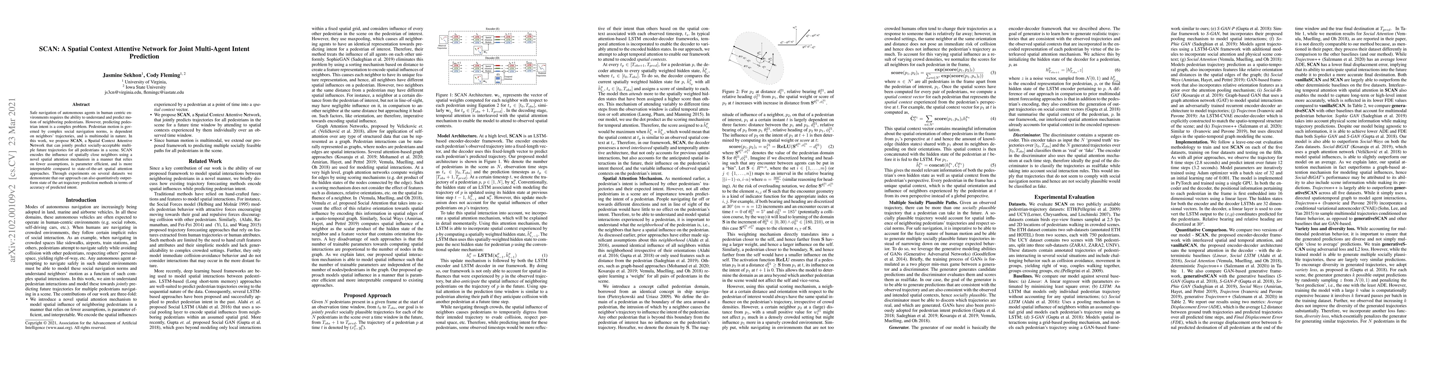 Safe navigation of autonomous agents in human centric environments requires the ability to understand and predict motion of neighboring pedestrians. However, predicting pedestrian intent is a complex problem. Pedestrian motion is governed by complex social navigation norms, is dependent on neighbors' trajectories, and is multimodal in nature. In this work, we propose SCAN, a Spatial Context Attentive Network that can jointly predict socially-acceptable multiple future trajectories for all pedestrians in a scene. SCAN encodes the influence of spatially close neighbors using a novel spatial attention mechanism in a manner that relies on fewer assumptions, is parameter efficient, and is more interpretable compared to state-of-the-art spatial attention approaches. Through experiments on several datasets we demonstrate that our approach can also quantitatively outperform state of the art trajectory prediction methods in terms of accuracy of predicted intent.